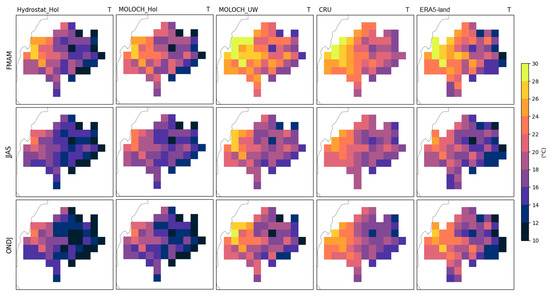 Seasonal mean surface air temperature over the UBNB for (FMAM, JJAS, and ONDJ) at (upper, middle, and lower) rows.