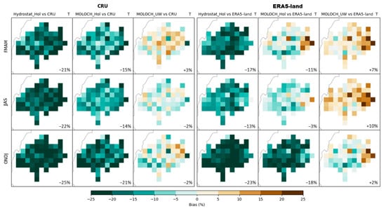 Figure 9 shows the spatially distributed Bias% of the mean seasonal surface air temperature simulation with respect to the CRU and ERA5-land reference datasets. Both the Hol scenarios show a highly seasonal cold bias up to 25%, except for the JJAS season in the MOLOCH-Hol simulation with minimal cold bias (−3%), compared to ERA5-land 2 m temperature data. The MOLOCH-UW also shows the best performance with up to a warm/cold bias of +3%/−2%, compared to CRU data. However, when compared to ERA5-land data, an unsatisfactory warm bias of 10% was found in JJAS, while an acceptable warm bias was observed during the other seasons, up to ≈+7%. These results are consistent with the precipitation assessment results in terms of the comparison between the simulations with ERA5-land and other observational data.
