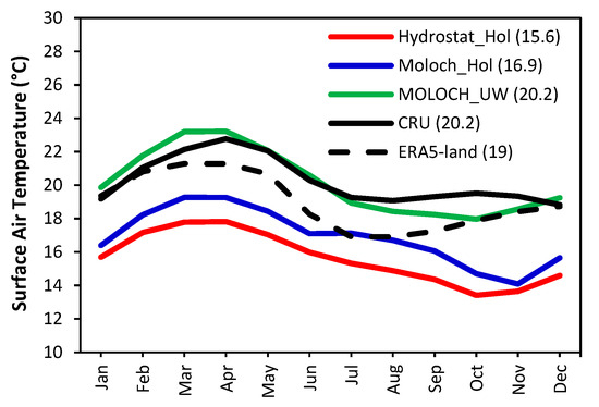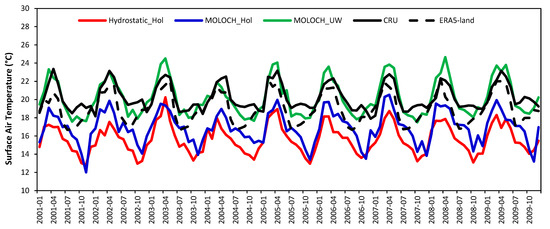 To assess the interannual variability of the RegCM5 simulations of the surface air temperature over the UBNB, a comparison between the three simulated scenarios and the CRU and ERA5-land reference datasets’ seasonal cycles is shown in Figure 10. Simulated and observational data reflect the seasonal trend, with the highest temperatures occurring during the March–May period. This aligns well with the climatic characteristics described by [34], where the hottest period occurs before the onset of the main wet season (JJAS). Among the model outputs, the MOLOCH-UW most accurately reproduces the observed pattern, closely matching the CRU data and capturing both timing and magnitude (annual mean of 20.2 °C) of the temperature cycle. In contrast, both Hydrostat_Hol and MOLOCH-Hol highly underestimate the observed temperatures throughout the year, particularly during the warm months. The cooler period during July and August, influenced by cloud cover, rainfall, and energy redistribution by evapotranspiration [34], was relatively captured in the MOLOCH-UW pattern only. This underscores the advantage of using the non-hydrostatic MOLOCH with the UW PBL scheme for more realistic surface air temperature simulation over the UBNB.