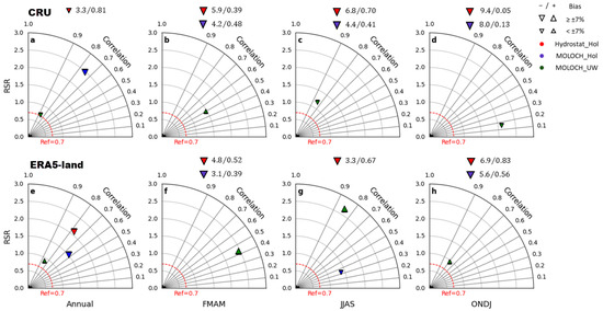 Constructed Taylor-style diagrams of Annual, FMAM, JJAS, and ONDJ temperature with respect to the CRU (top row: a,b,c,d, respectively) and ERA5-land (bottom row: e,f,g,h, respectively).