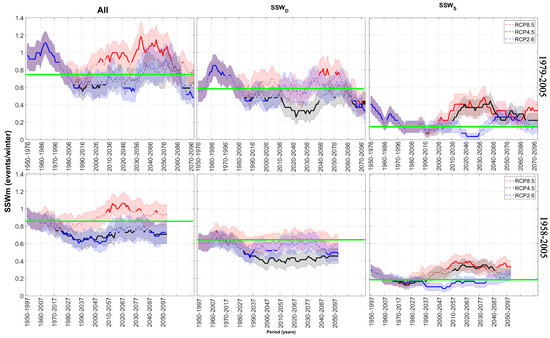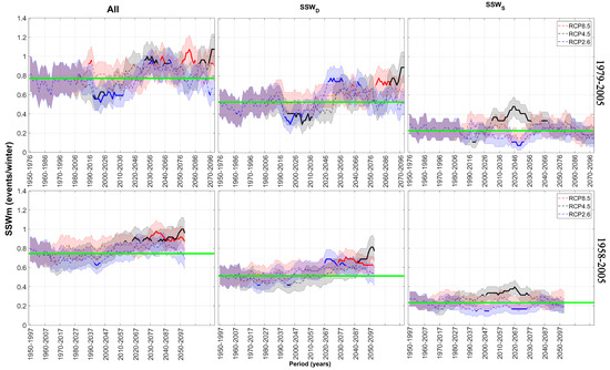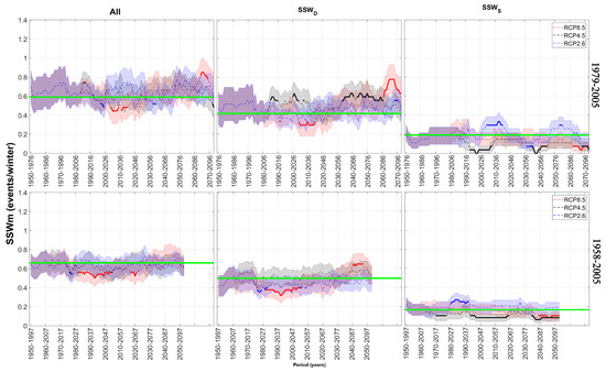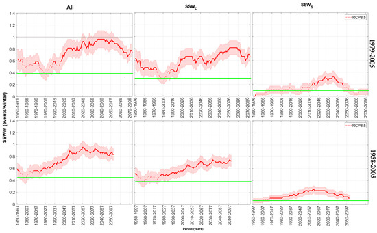 To assess future changes in SSWm frequency, we used a moving-window methodology as an extension of previous work [26]. The procedure consists of counting events within consecutive 27-year intervals, shifting the window by one year across 2006–2100. This window length matches the duration of the two historical periods used as reference here: 1979–2005 (satellite era) and 1958–2005 (extended, including the pre-satellite era). This technique allows identifying smooth trends and possible non-monotonic changes in SSWm frequency, reducing the influence of short-term internal variability and the progressive intensification of radiative forcing during the 21st century.