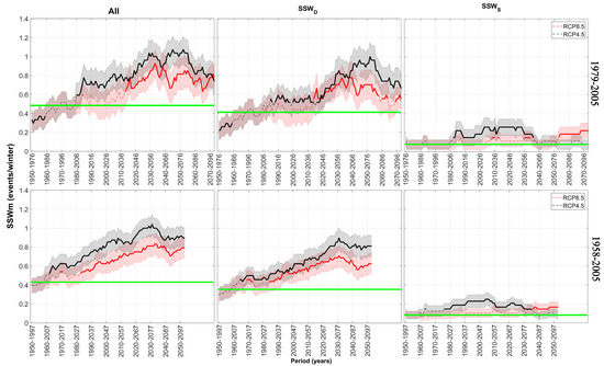Temporal evolution of the annual SSWm frequency for the PSL-CM5A-MR model under the RCP scenarios. The blue (RCP2.6), black (RCP4.5), and red (RCP8.5) curves represent the time series of SSWm frequency. The dashed line corresponds to the moving average (27 years in the (upper panel) and 48 years in the (lower panel)). The shaded area indicates the standard error. Solid line segments indicate values significantly different at the 5% level relative to the reference period: (upper panel) for 1979–2005 and (lower panel) for 1958–2005. The green horizontal line indicates the observed mean SSWm frequency for the corresponding reference period: 1979–2005 in the (upper panel) and 1958–2005 in the (lower panel).