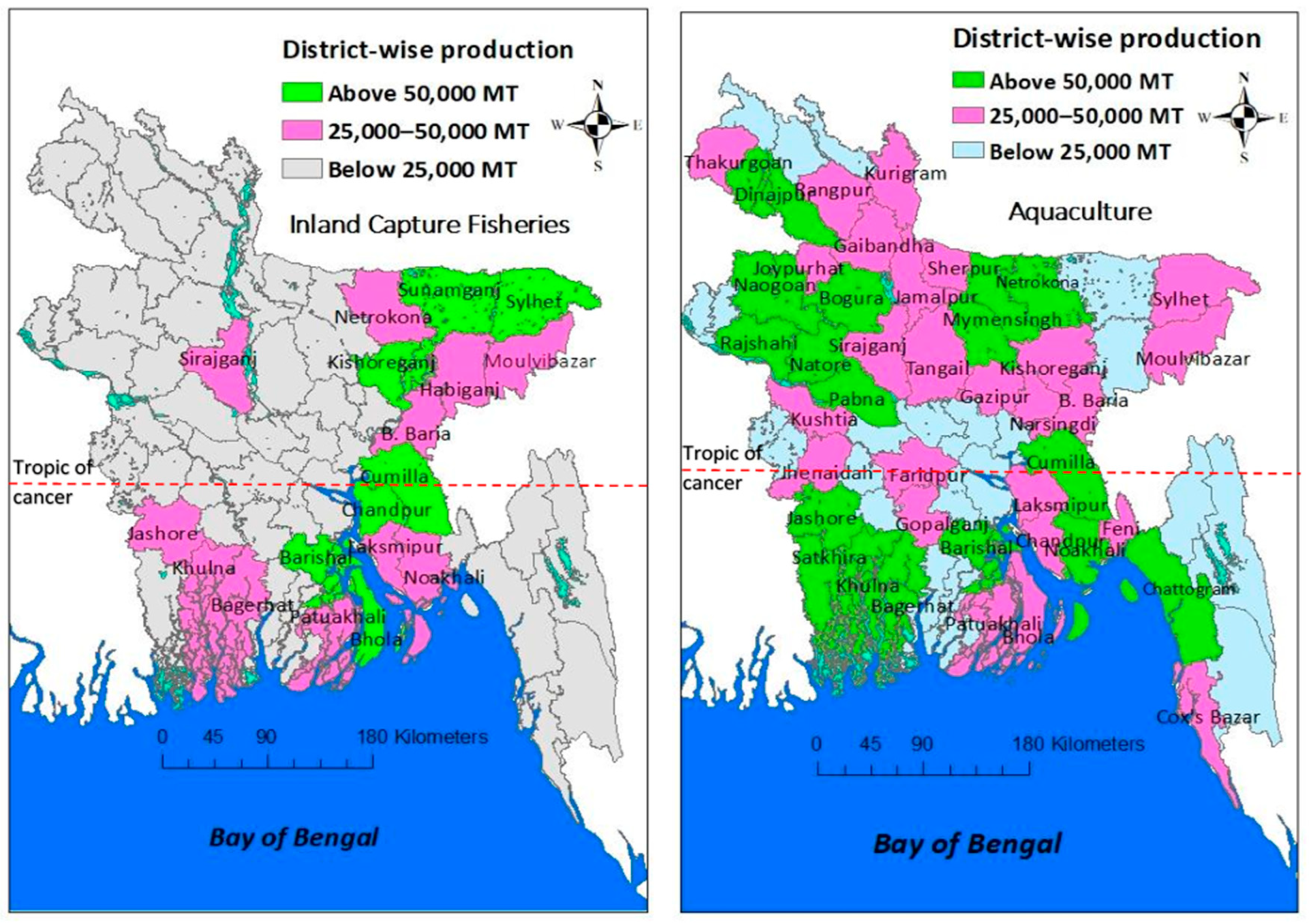 - Department of Fisheries (DoF). Yearbook of Fisheries Statistics of Bangladesh, 2022–23; Fisheries Resources Survey System (FRSS), Department of Fisheries: Dhaka, Bangladesh, 2023.