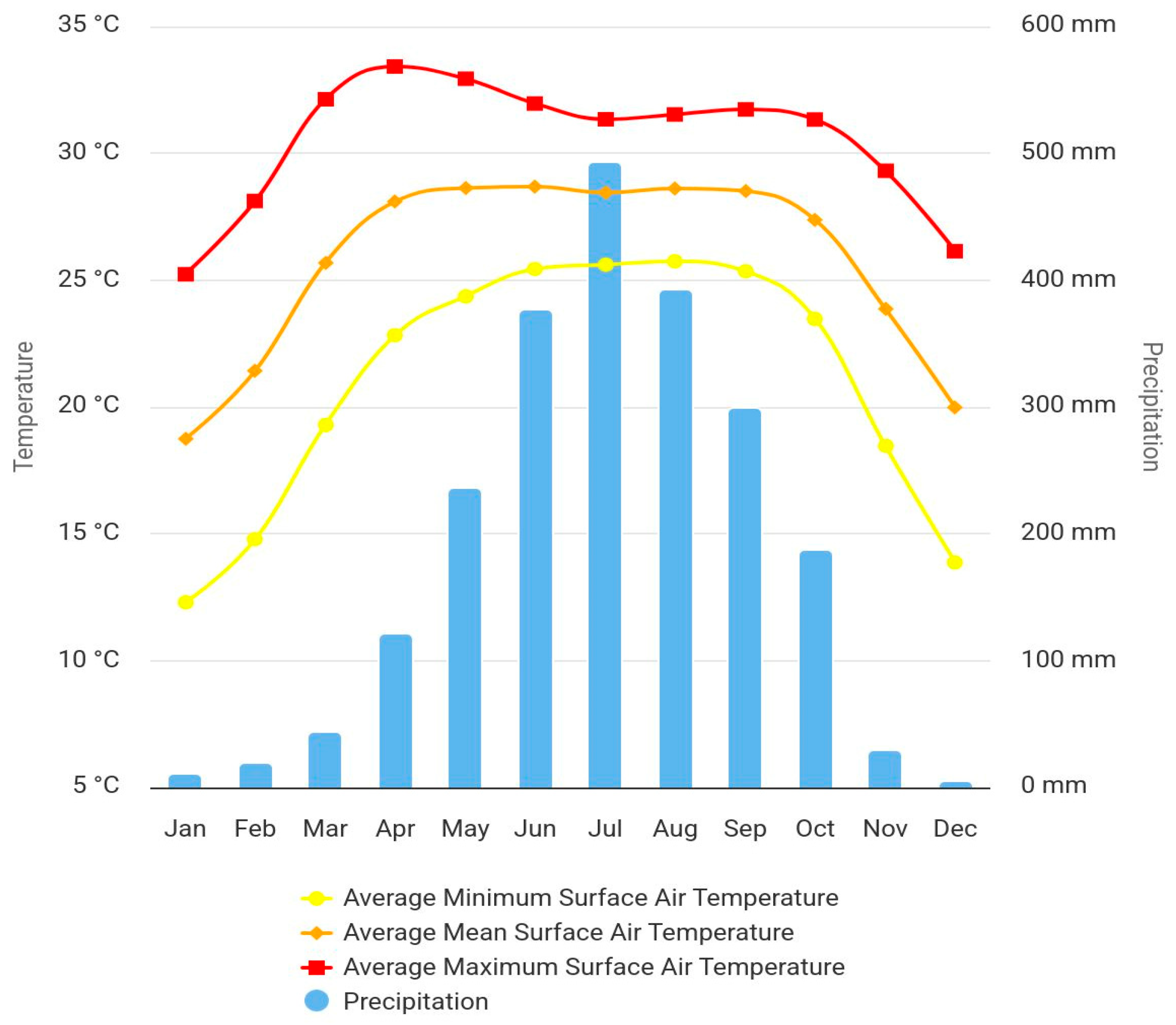 - Ministry of Defence; Government of the People’s Republic of Bangladesh. Monthly Climatological Data (1991–2023); Ministry of Defence: Dhaka, Bangladesh, 2023.