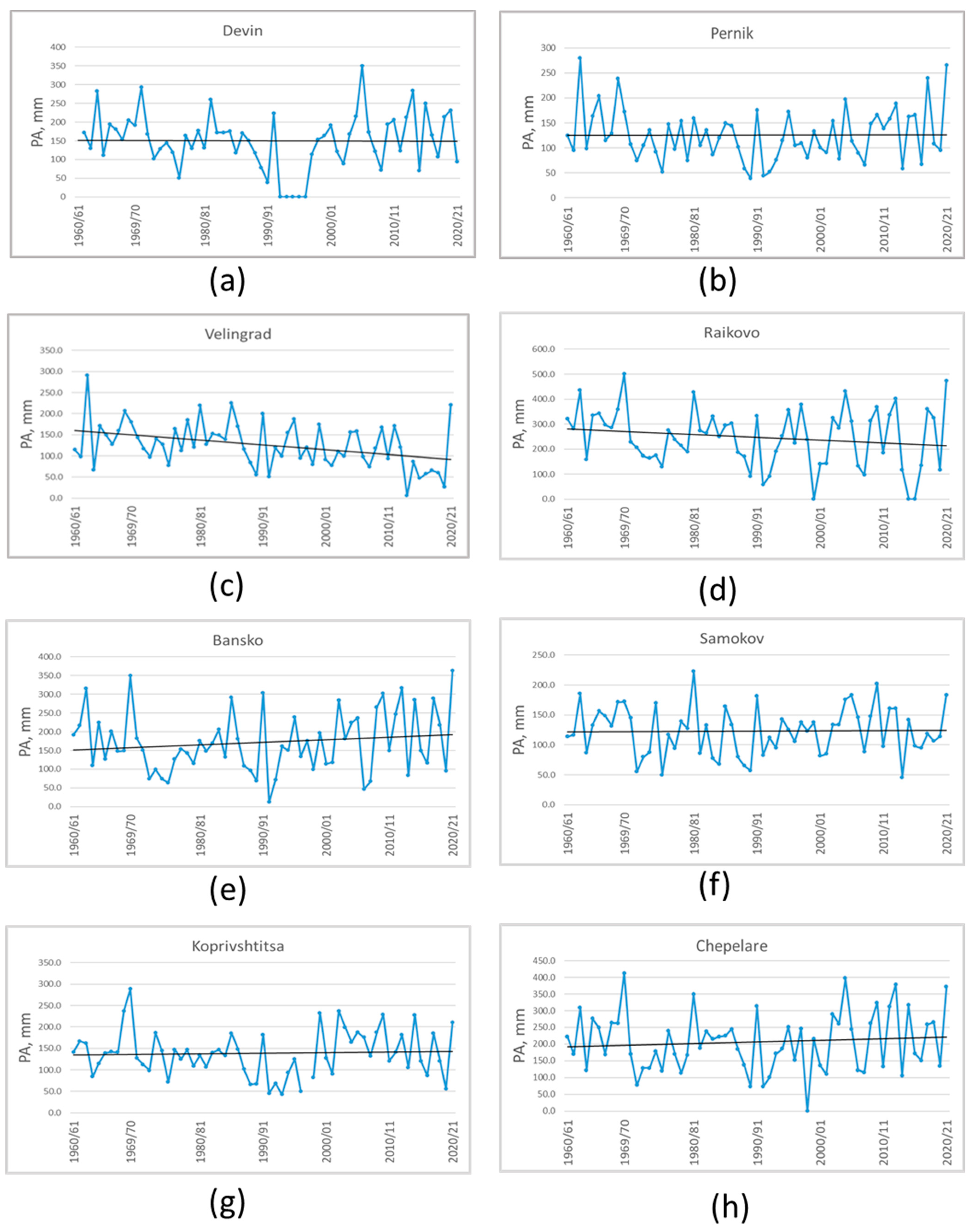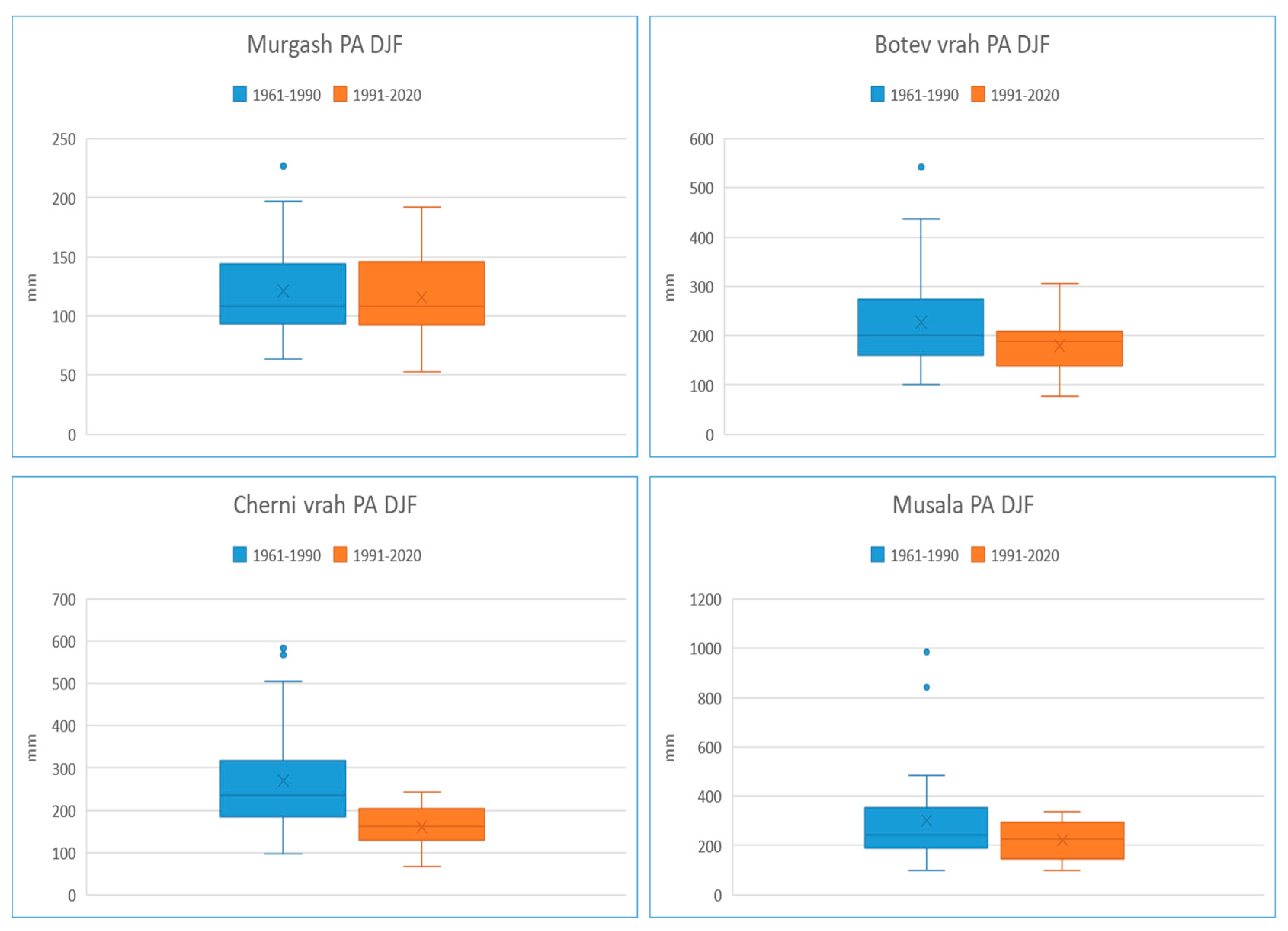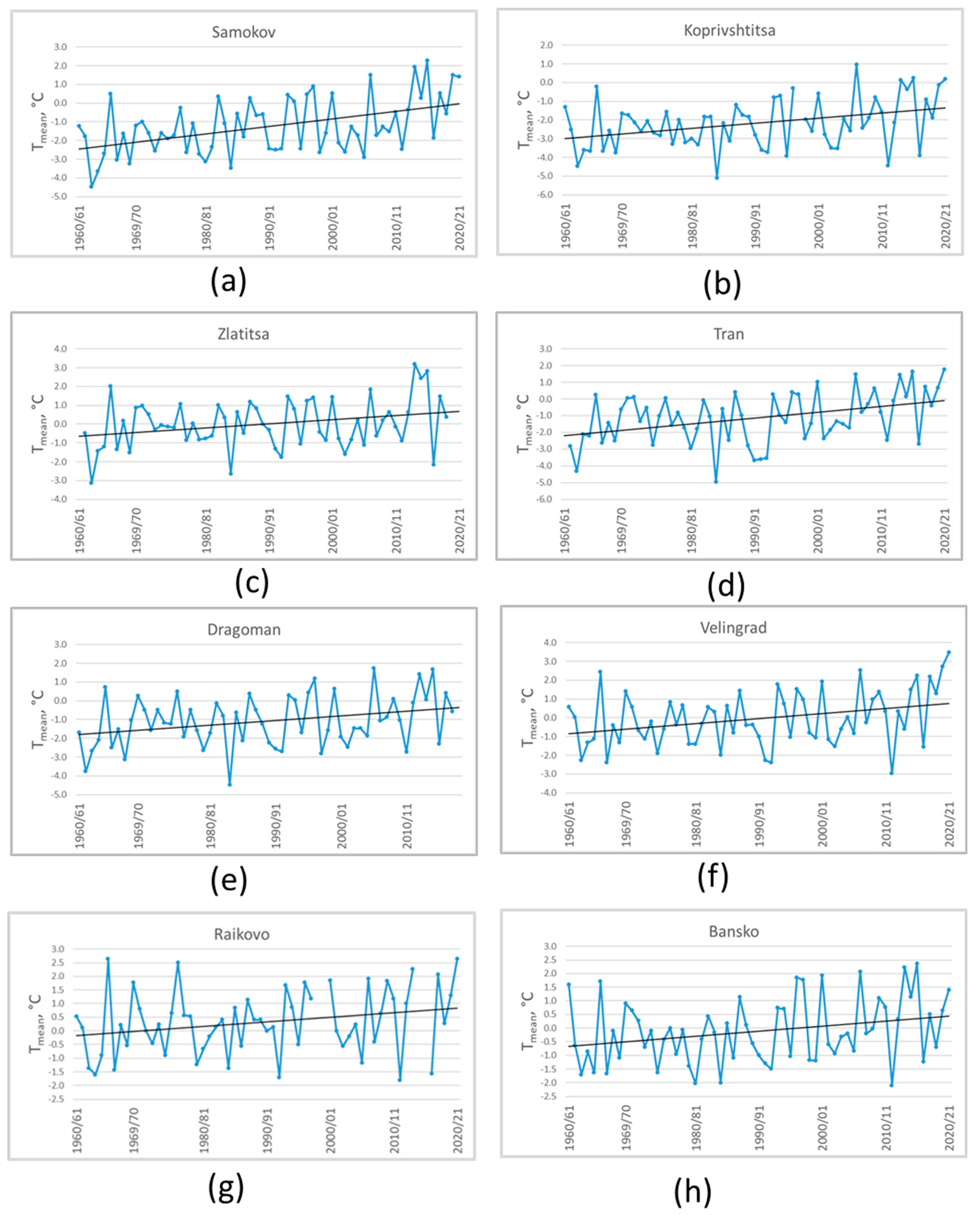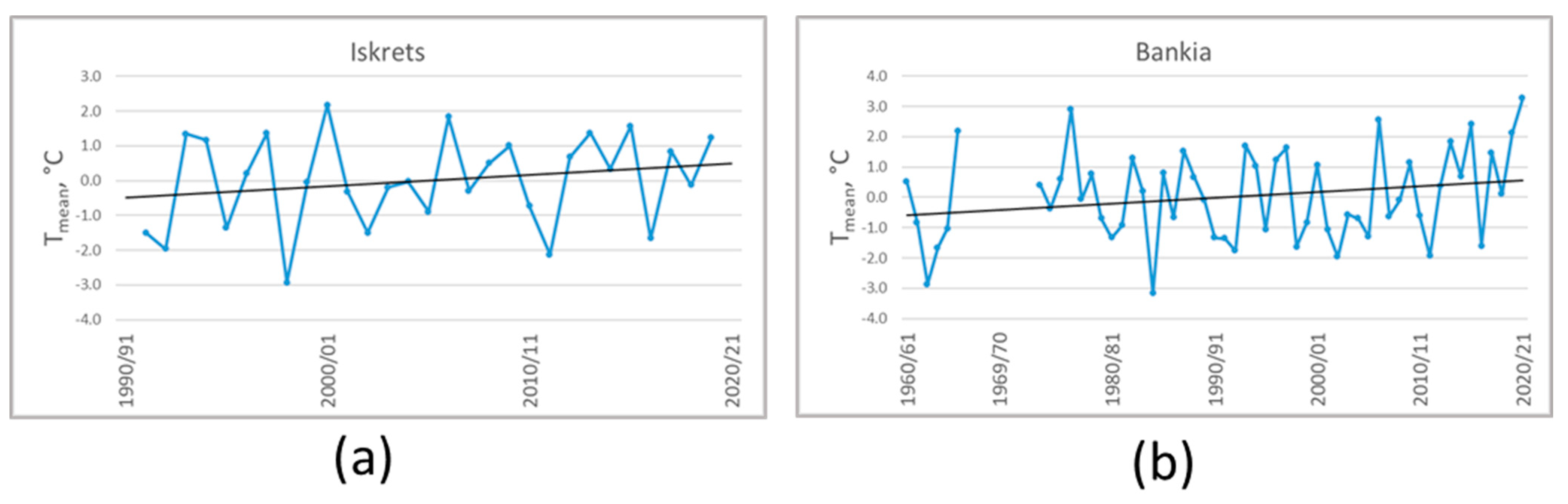 - Nikolov, D.; Dimitrov, C. Analysis of the variability of the winter precipitations and temperatures in two mountain regions of Bulgaria, 2022, SGEM Conference Paper. In Proceedings of the 22nd SGEM International Multidisciplinary Scientific GeoConference Proceedings 2022, Vienna, Austria, 6–8 December 2022. [Google Scholar] [CrossRef]
