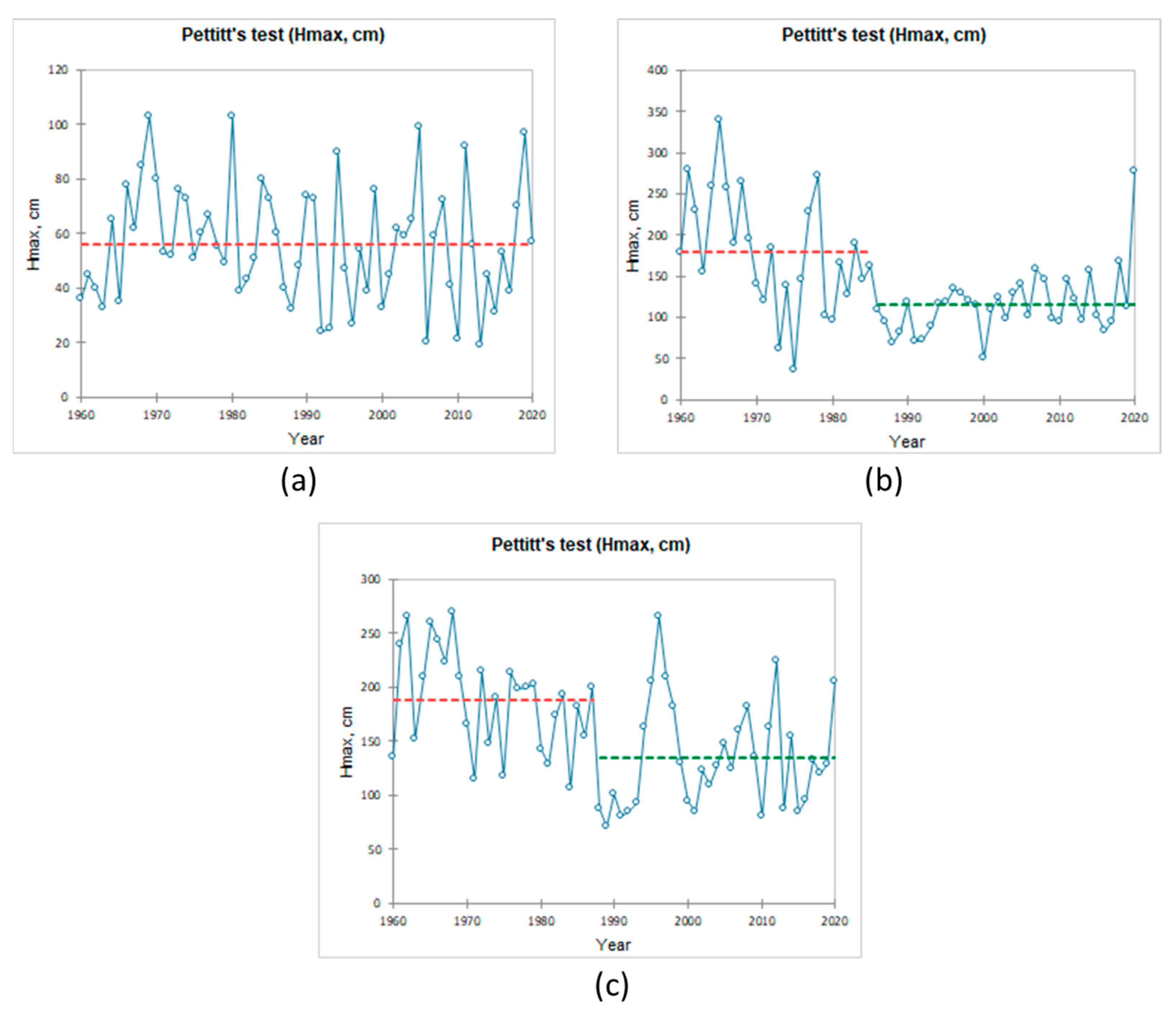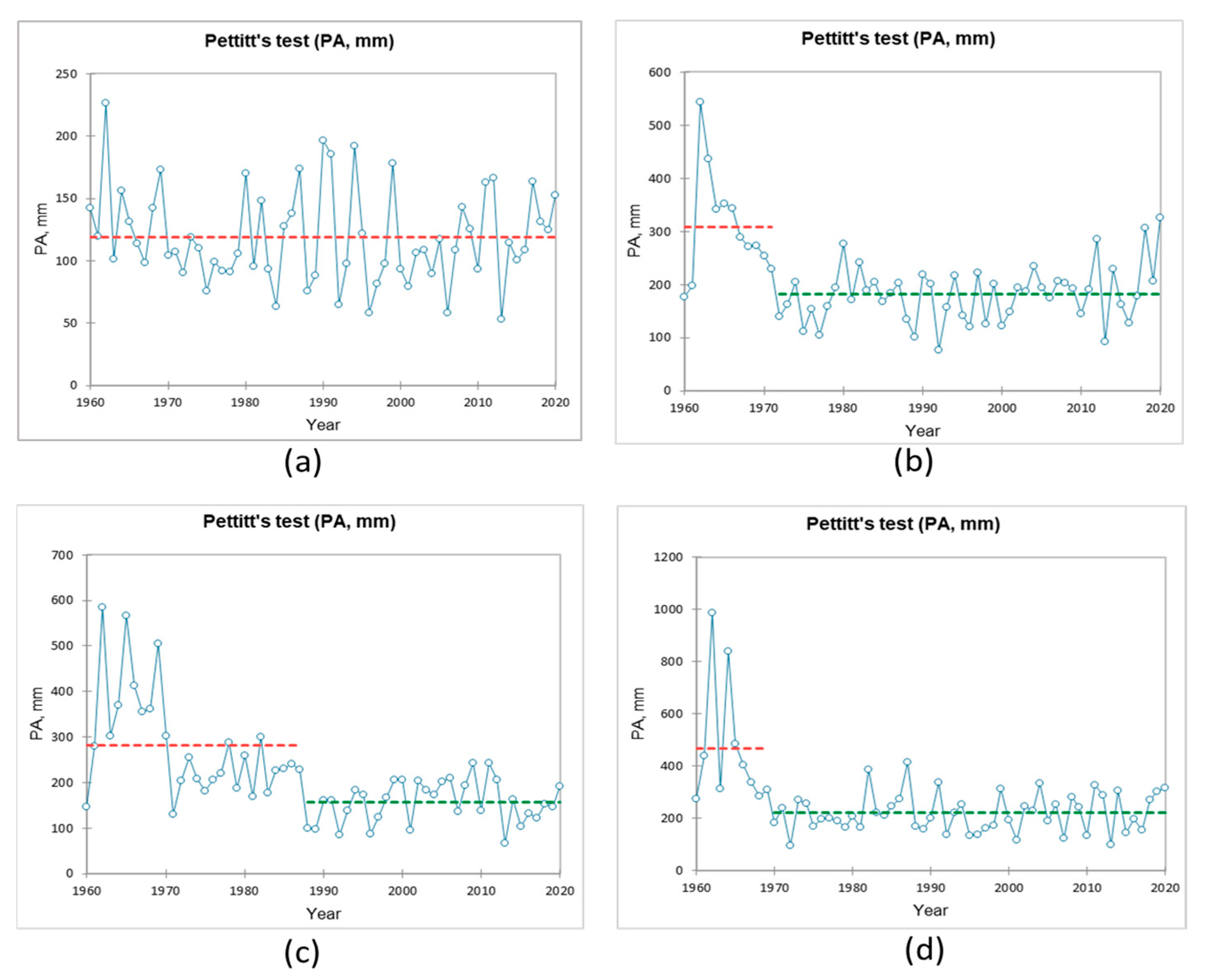 - Pettitt, A.N. A non-parametric approach to the change point problem. J. R. Stat. Soc. Ser. C Appl. Stat. 1979, 28, 126–135. [Google Scholar] [CrossRef]
