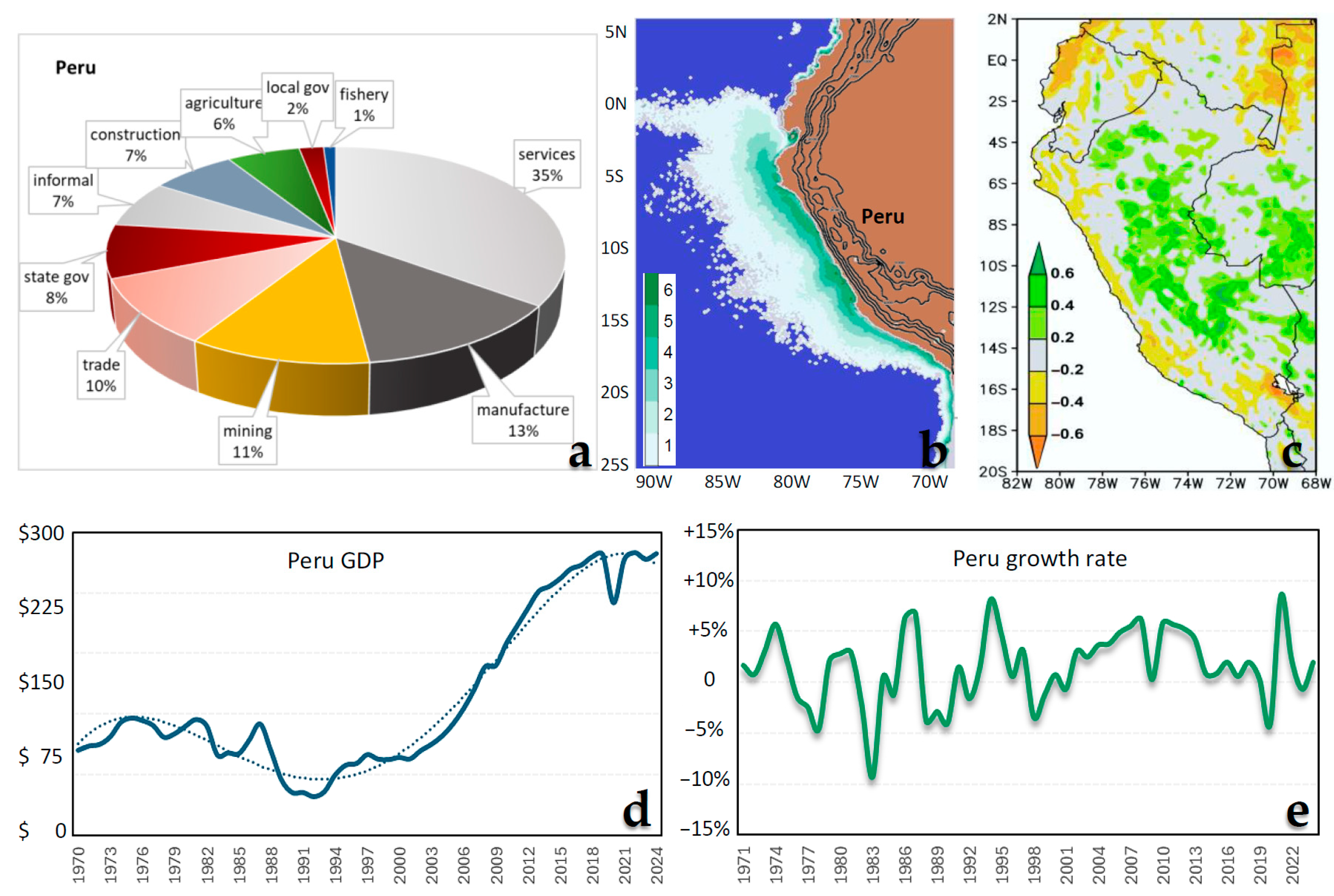 Jury, M.R. Sensitivity of Peru’s Economic Growth Rate to Regional Climate Variability. Climate 2025, 13, 216. https://doi.org/10.3390/cli13100216