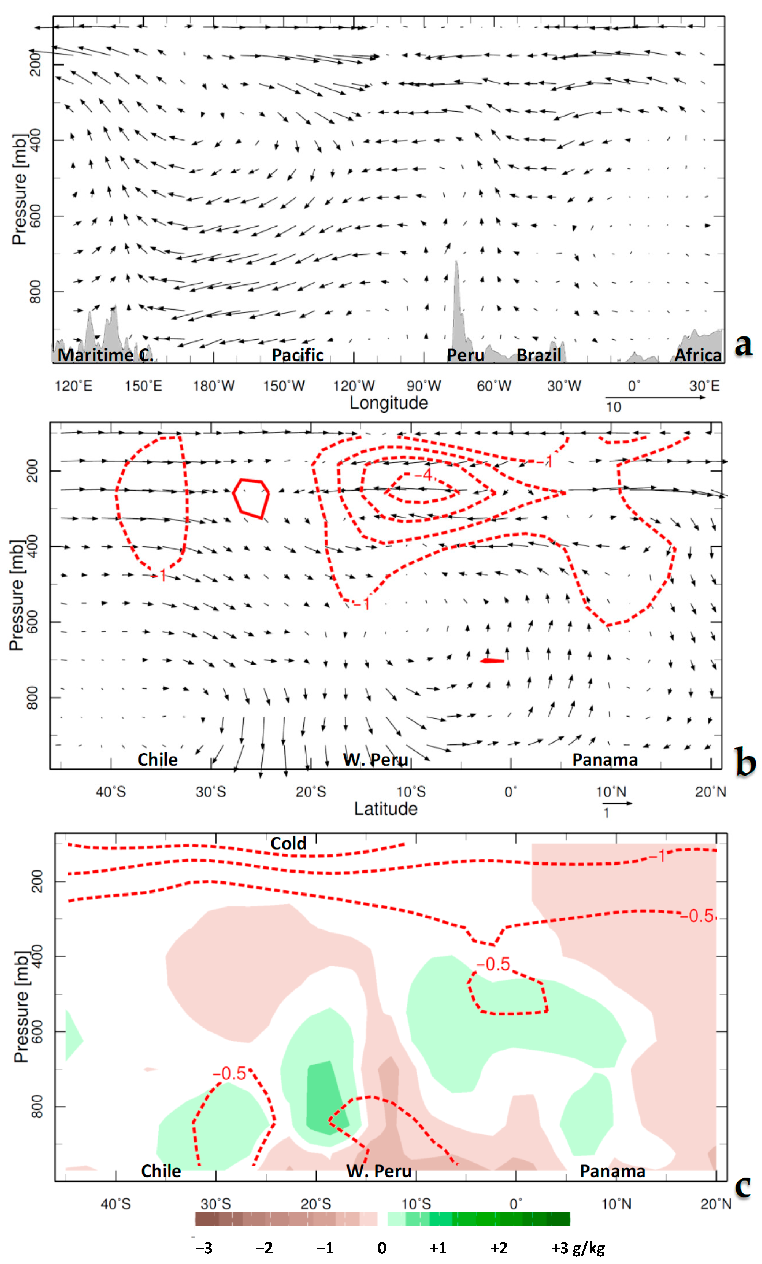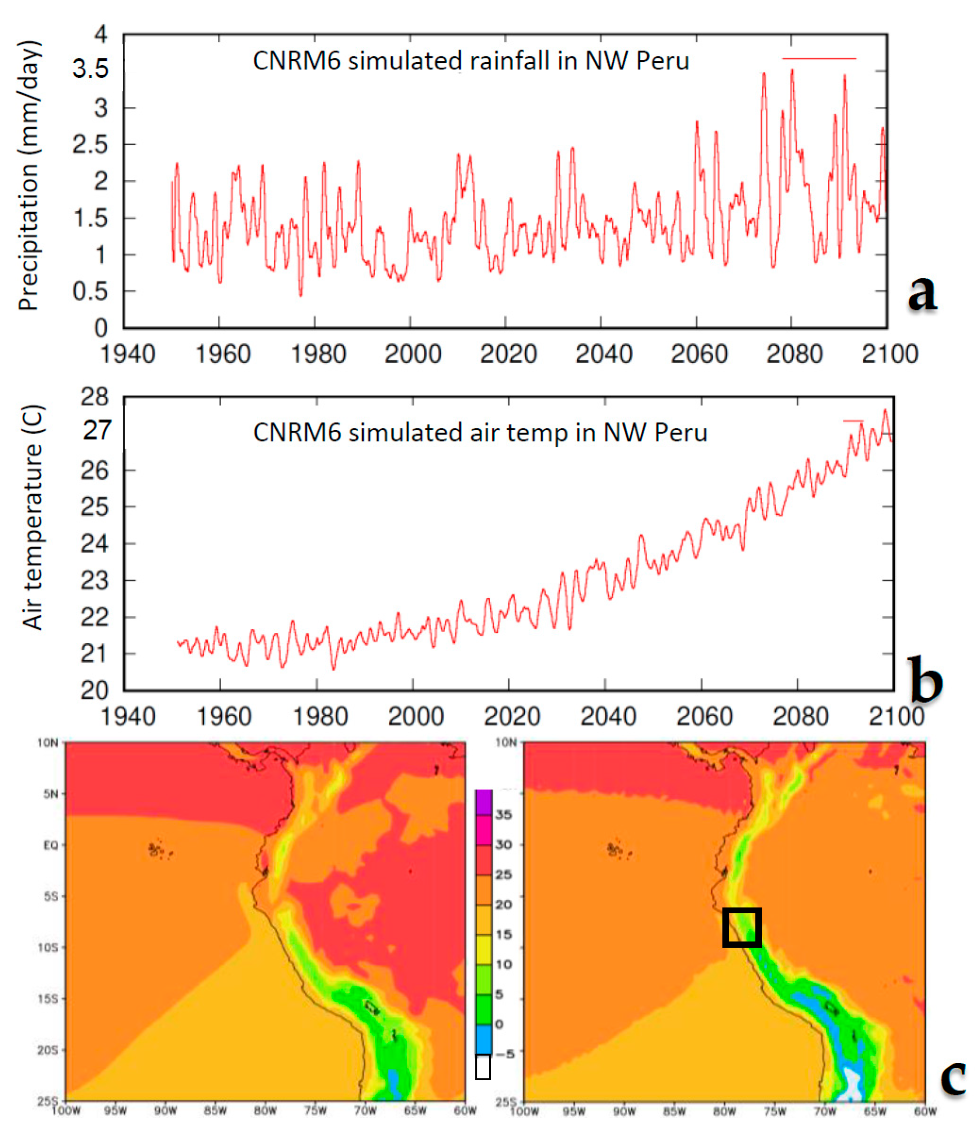 - Jury, M.R.; Alfaro-Garcia, L. Peru north coast climate variability and regional ocean-atmosphere forcing. Coasts 2024, 4, 508–534. [Google Scholar] [CrossRef]