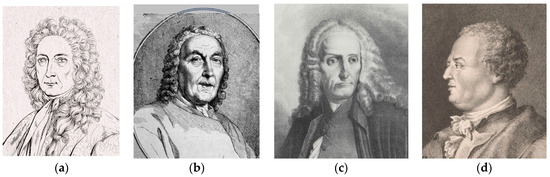 Portraits: (a) Giovanni Poleni; (b) Giovan Battista Morgagni; (c) Bernardino Zendrini; and (d) Tommaso Temanza. (Credits: (a,c) Austrian National Library, Public Domain; (b) Rijksmuseum, Amsterdam, Public Domain; and (d) Wellcome Collection, UK, CC-BY).