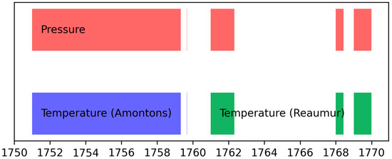 The timeline of the observations made by Temanza is reported in Figure 2. From 1751 to 1759, the activity was regular, but then they are no longer. Temanza used a barometer, an Amontons thermometer (from 1751 to 1759), and a Réaumur thermometer (from 1761 to 1769) [6,11,24]. These instruments are shortly presented in this section and extensively discussed in Section 3.