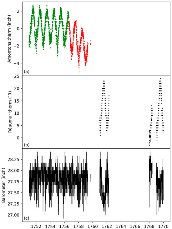 Original readings of Temanza measurements: (a) Amontons thermometer (Venice inches): green and red points are un-drifted and drifted values, respectively; (b) Réaumur thermometer (°R); and (c) barometer (Venice inches).