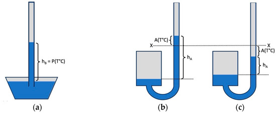 Scheme of how to read the temperature using Temanza’s Amontons thermometer. (a) Barometer; hB is the height of the mercury column that allows us to estimate the pressure P (T°C). (b) Amontons thermometer when temperature is greater than the “Temperate” value X; hA is the height of the mercury column; and A (T°C) is the same height referring to the mercury level when the temperature is X. (c) Amontons thermometer when temperature is less than the “Temperate”. The meaning of the symbols is the same as in (b).
