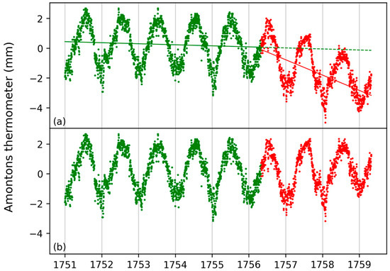 The data from 1 January 1751 to 1 May 1756 show a slight downward trend of with a p-value of (green line in Figure 7a). The drifted data show a trend with a p-value of 0 (red line in Figure 7a). After the drift was corrected, the Amontons readings appear as in Figure 7b.