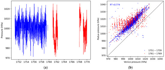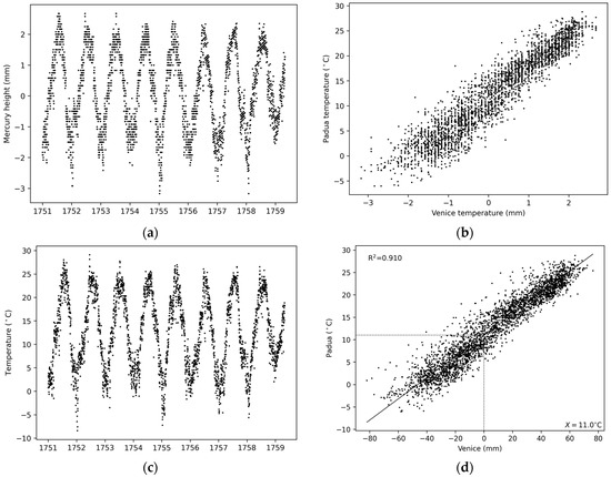 Temanza measured pressure and temperature once a day. When he was working in Venice, he observed without gaps. He used the Amontons thermometer from 1 January 1751 to 30 April 1759, and from 1 to 4 September 1759 (Figure 5a). The original scale, as explained above, refers to an unknown reference X. In 1756, something happened to that instrument, since from that year onward, the data drifted (red dots in Figure 5a). Air thermometers were very fragile, and a microcrack on the glasswork or the sealing affected the pressurized air pocket and the instrument response. A similar problem was observed in 1719, i.e., 37 years before, with a Stancari air thermometer, in Bologna [36]. Probably at the end of 1759, Temanza recognized the problem, abandoned this instrument, and used another thermometer.