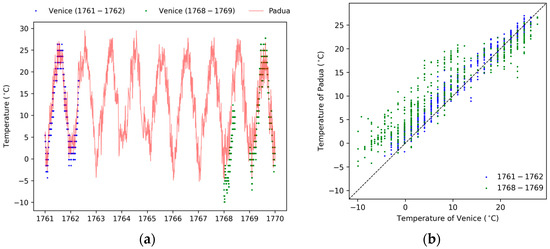 The use of arbitrary units, the lack of calibration and other useful metadata discouraged scholars from analyzing Temanza’s readings. Two centuries ago, the Danish climatologist Schouw concluded bitterly, “I do not believe that conclusions can be drawn from these data” [11]. In fact, all the meteorological observations made in Venice during the 18th century can be criticized. Referring to the Venice observers (including Zendrini and Temanza), Schouw was strongly skeptical and categorical: “all these data cannot be trusted” [11]. This severe judgment was justified from the point of view of those who looked back and noted various flaws in the technical–scientific rigor. However, even if the data provided by the early pioneers were taken in a non-standard way, they constitute the only information available for Venice, obtained during the coldest period of the Little Ice Age. They cover a period in which instrumentally acquired meteorological observations were very rare; thus, the data deserves the utmost attention to ensure as much information is extracted as possible.