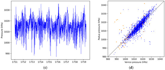 In this work, the series of Padua has been used as a reference for two reasons: (i) its short distance from Venice, while also being in the same climatic area and (ii) the quality of the series. Padua has the longest unbroken and best documented series of temperature, pressure, and precipitation in Italy, and among the longest in the world. For this reason it has been recovered, accurately controlled, homogenized, and validated in two European funded projects, i.e., IMPROVE (ENV4-CT97-0511, 1998–2000) and MILLENNIUM (STRIP-017008-2, 2006–2009), to be used as a useful reference for other series.
