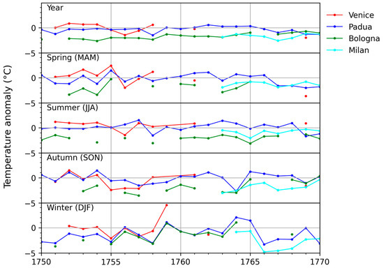 - Camuffo, D.; della Valle, A.; Bertolin, C.; Santorelli, E. Temperature Observations in Bologna, Italy, from 1715 to 1815: A Comparison with Other Contemporary Series and an Overview of Three Centuries of Changing Climate. Clim. Change 2017, 142, 7–22. [Google Scholar] [CrossRef]