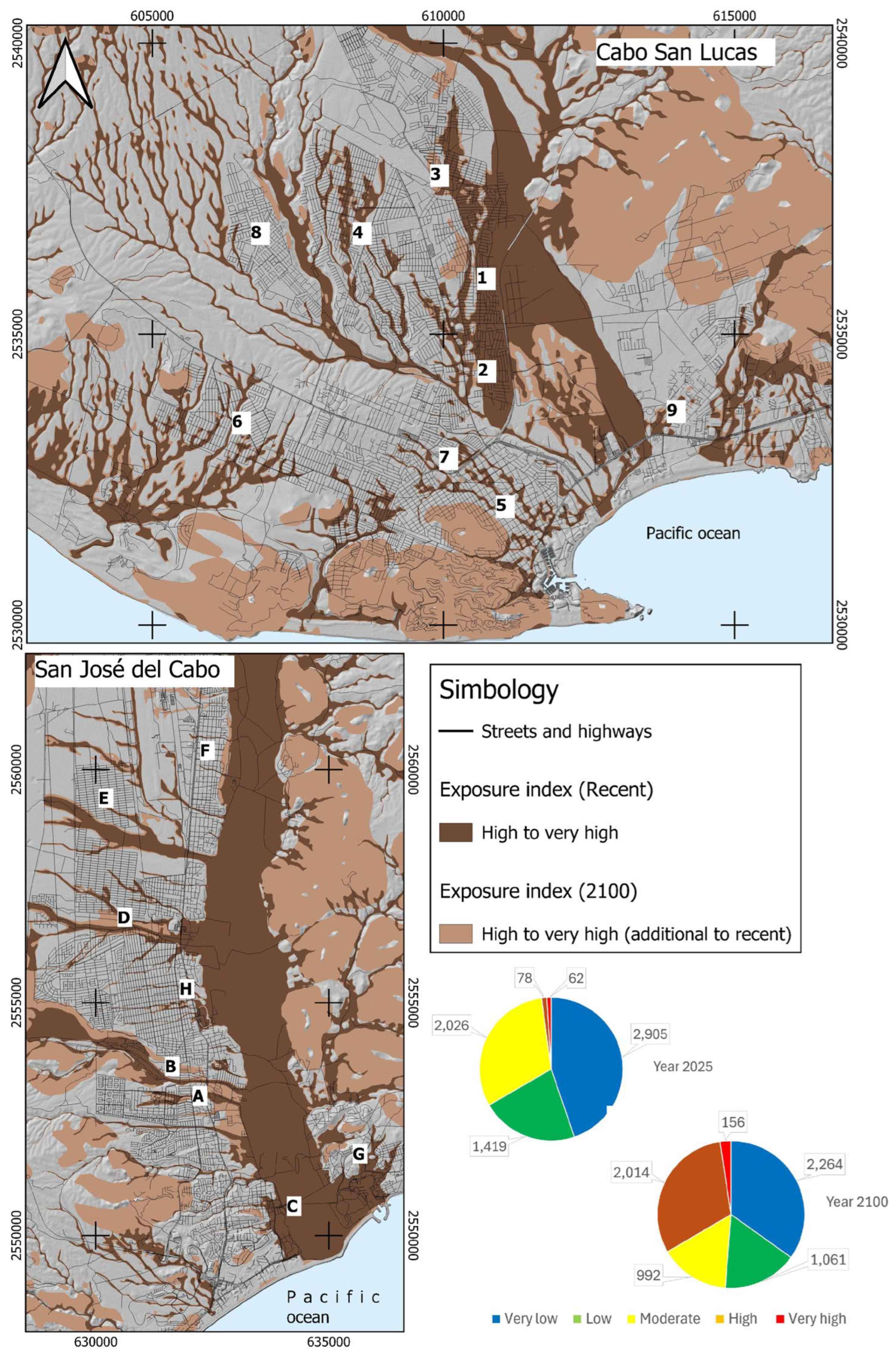 Figure 2). While most of this area consists of unimpacted creeks, streams, and undeveloped land, a significant portion includes urban areas such as Caribe-Caribe Bajo (1), Lagunitas (2), Gastelum (3), Las Palmas-Mesa Colorada (4), Downtown Cabo San Lucas (5), Cangrejos (6), and 4 de Marzo (7). In San José del Cabo, the exposed areas include Lomas de Guaymitas (A), Vado Santa Rosa (B), Downtown (C), Vado Puerto Nuevo (D), and Vado La Ballena (E) (see