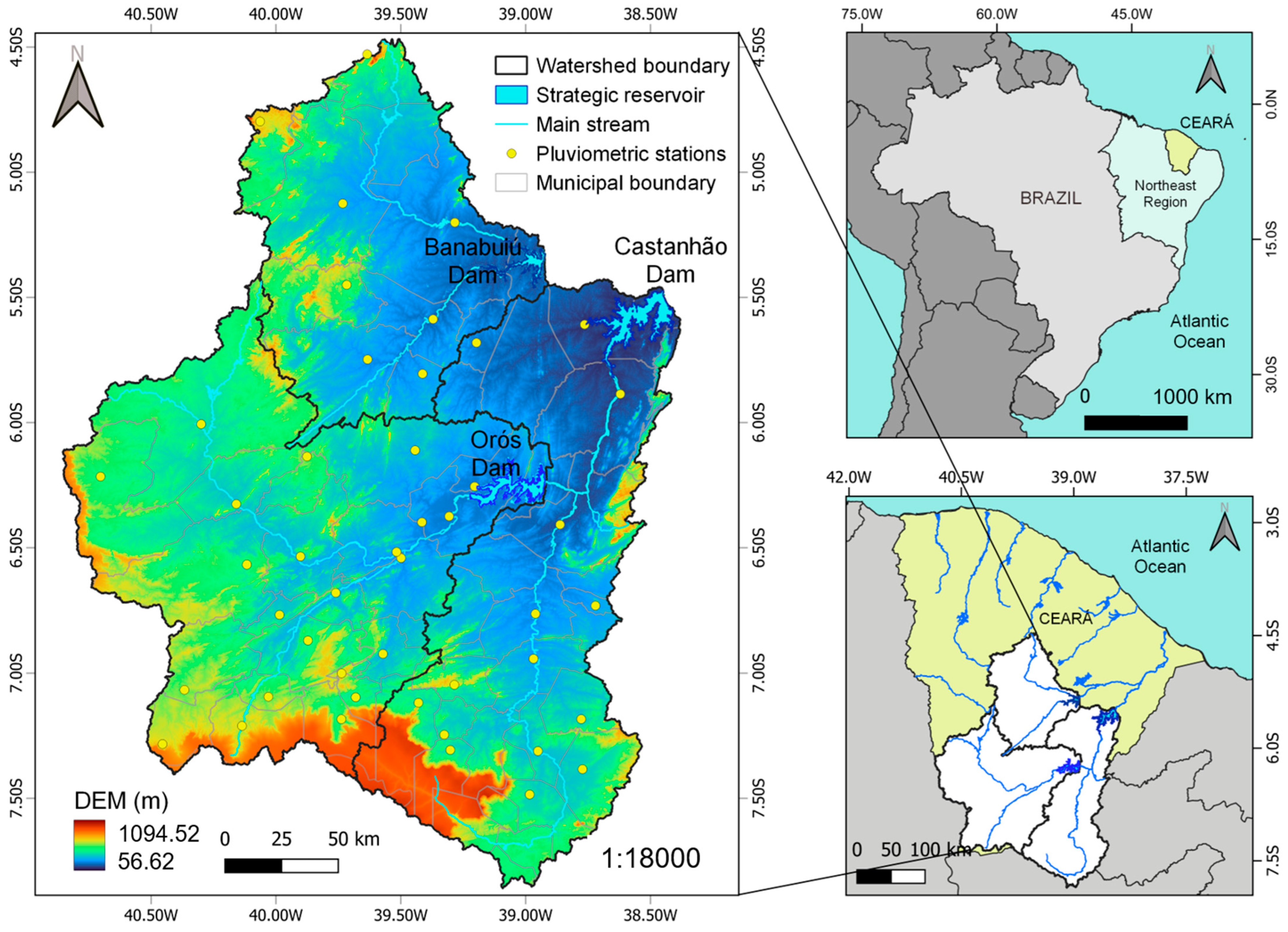 In this region, water demand is mainly met by the stored water in reservoirs. Among them, 153 reservoirs are monitored and the three major ones were selected: Banabuiú (with an accumulation capacity of 1534.00 hm3), Castanhão (with an accumulation capacity of 6700.00 hm3), and Orós (with an accumulation capacity of 1940.00 hm3). These reservoirs are located in the Banabuiú, Middle Jaguaribe, and Upper Jaguaribe sub-watersheds, respectively.