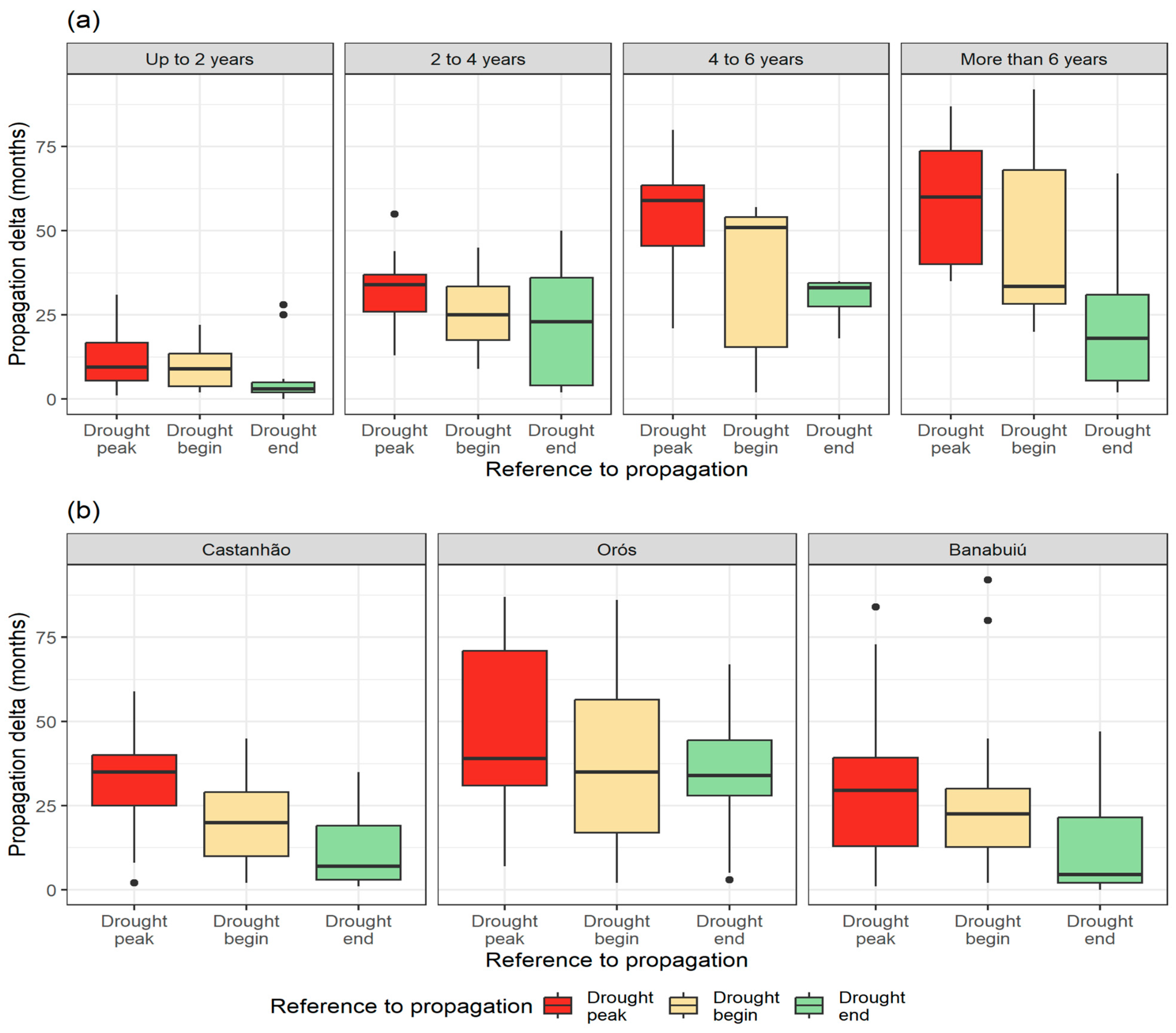 Figure 5. In Castanhão, the median propagation time from the drought peak is around 35 months, indicating a delayed but steady impact. The hydrological response to the drought end is relatively quick (median under 10 months), suggesting that this reservoir system can recover more efficiently. Orós shows the longest propagation times across all reference points, especially from the drought peak. Hydrological recovery is also slower, suggesting higher vulnerability or a greater dependence on sustained rainfall for recovery. Banabuiú exhibits lower median propagation times than the other two reservoirs but with greater variability. This indicates a more sensitive and possibly reactive system, with quicker responses but less predictability.