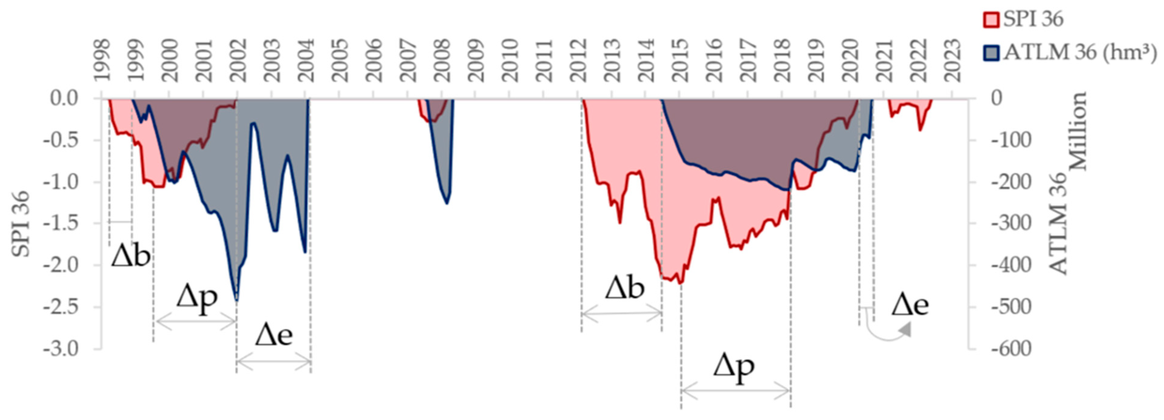 In addition, the consistent pattern observed (Δp > Δb > Δe) corroborates global findings that the peak hydrological impact occurs significantly after the meteorological peak, and that the recovery of water systems (termination of hydrological drought) is a slower process than its inception, even after the meteorological drought has ended [