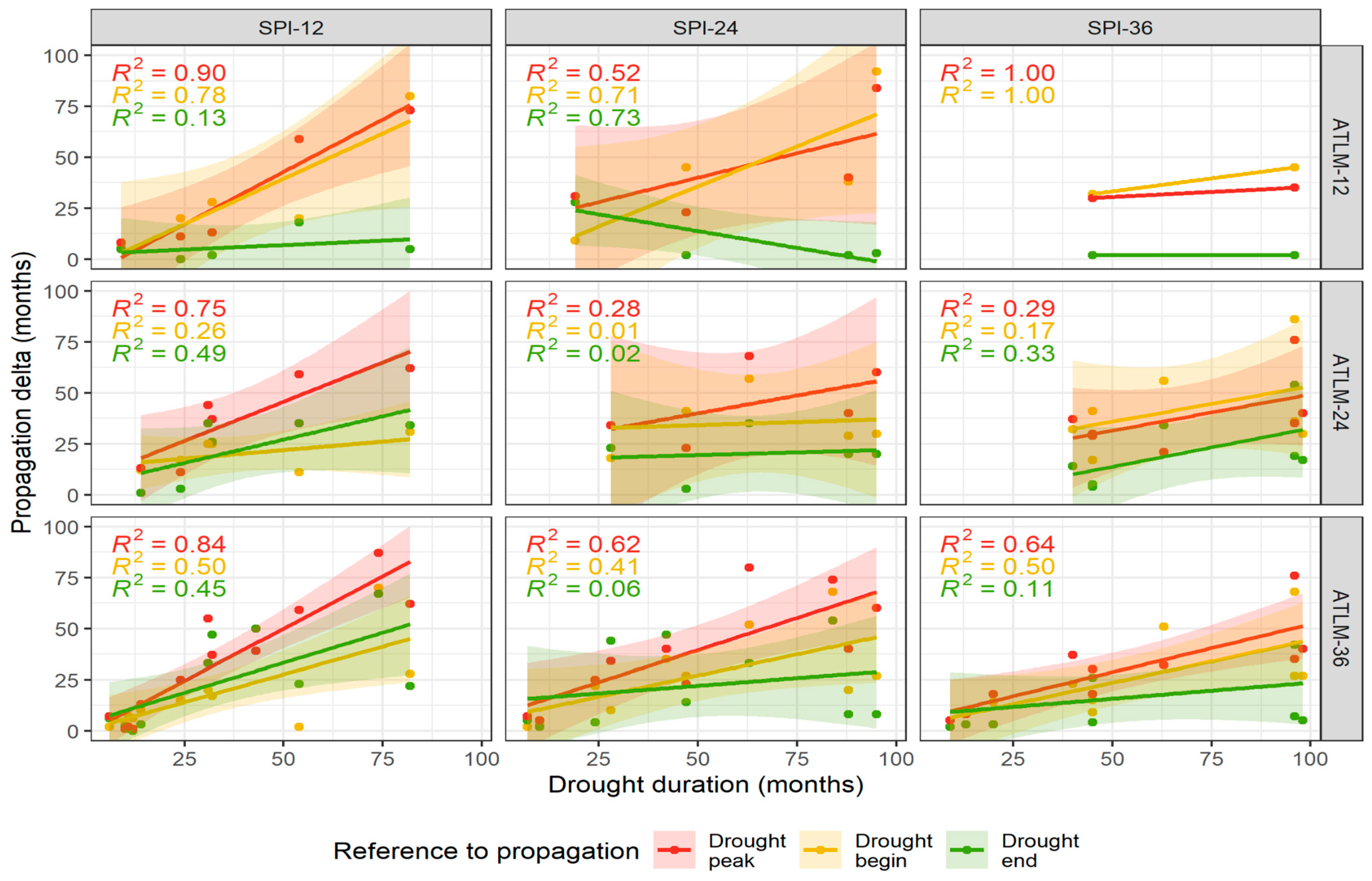Figure 8). For this analysis, the droughts from the three watersheds were grouped together. Pearson’s correlation test was applied between the duration of the meteorological drought and the propagation lag. It was applied for different combinations of SPI and ATLM time scales and for each lag marker (Δp, Δb, and Δe). In the Pearson’s correlation test, the test statistic follows a