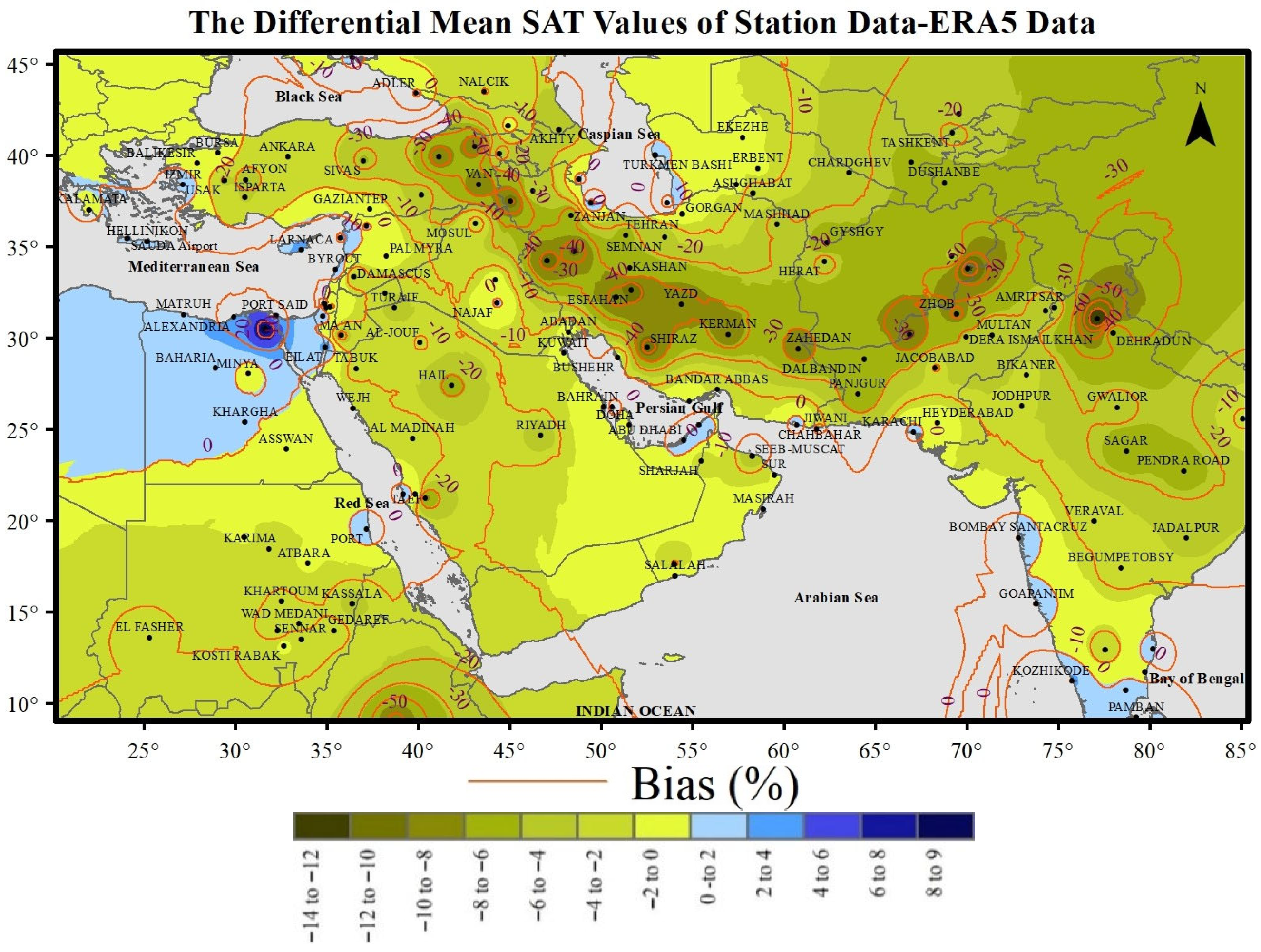 - To determine bias in the ERA5 dataset, we subtracted simulated SAT data from the corresponding observed values at 151 meteorological stations (Table S1, column 9). Bias and bias percentage were calculated as follows: Bias = [(SATobserved-data − SATmodeled-data)] and [Bias% = (100 × Bias)/Observed data], respectively. Positive (negative) bias values indicate the model’s underestimation (overestimation) [91].
