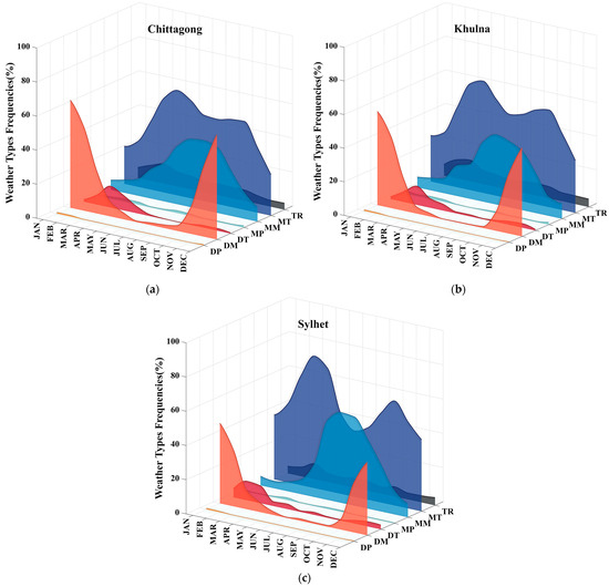 Moving into the pre-monsoon (MAM), DM declines sharply from an average 41.8% in February to 18.1% in March, nearly disappearing by May as heating intensifies. In response, DT emerges most clearly in MAM, peaking in April (11.3% on average), reflecting the hot, comparatively drier episodes typical of the pre-monsoon season when national maximum temperatures also become highest [21,39,41]. In parallel, MT weather types in-crease steeply, with cross-station frequencies averaging 65.4% by April, particularly in Sylhet where the highest MT frequency is observed (77.2% in April). This regional spike may be associated with pre-monsoon thunderstorms (Ts)/ Nor’westers (locally known as Kalbaishakhi), which are intense mesoscale convective systems that typically form over northwestern and eastern Bangladesh and move southeastward, often bringing heavy rainfall, gusty winds, and lightning [53,54]. Evidence suggests that Sylhet, located in the northeast, experiences the highest frequency of Ts, while southeastern regions like Chittagong experience fewer [55,56,57]. Since MT types often capture moist convective episodes in SSC [58], this may partly explain the elevated MT frequencies observed in Sylhet.