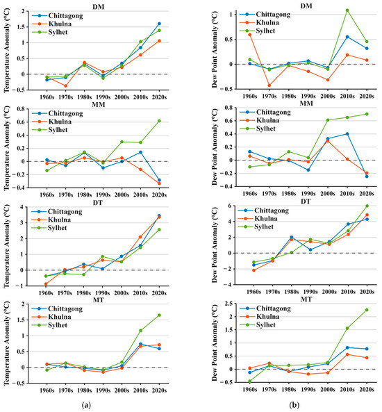 Decadal temperature (a) and dew point temperature (b) anomalies (°C) for DM, MM, DT and MT days across the study stations, evaluated at 09:00 UTC (3:00 PM BST) and computed relative to the 1960–1999 climatological baseline, represented by dashed lines (---).