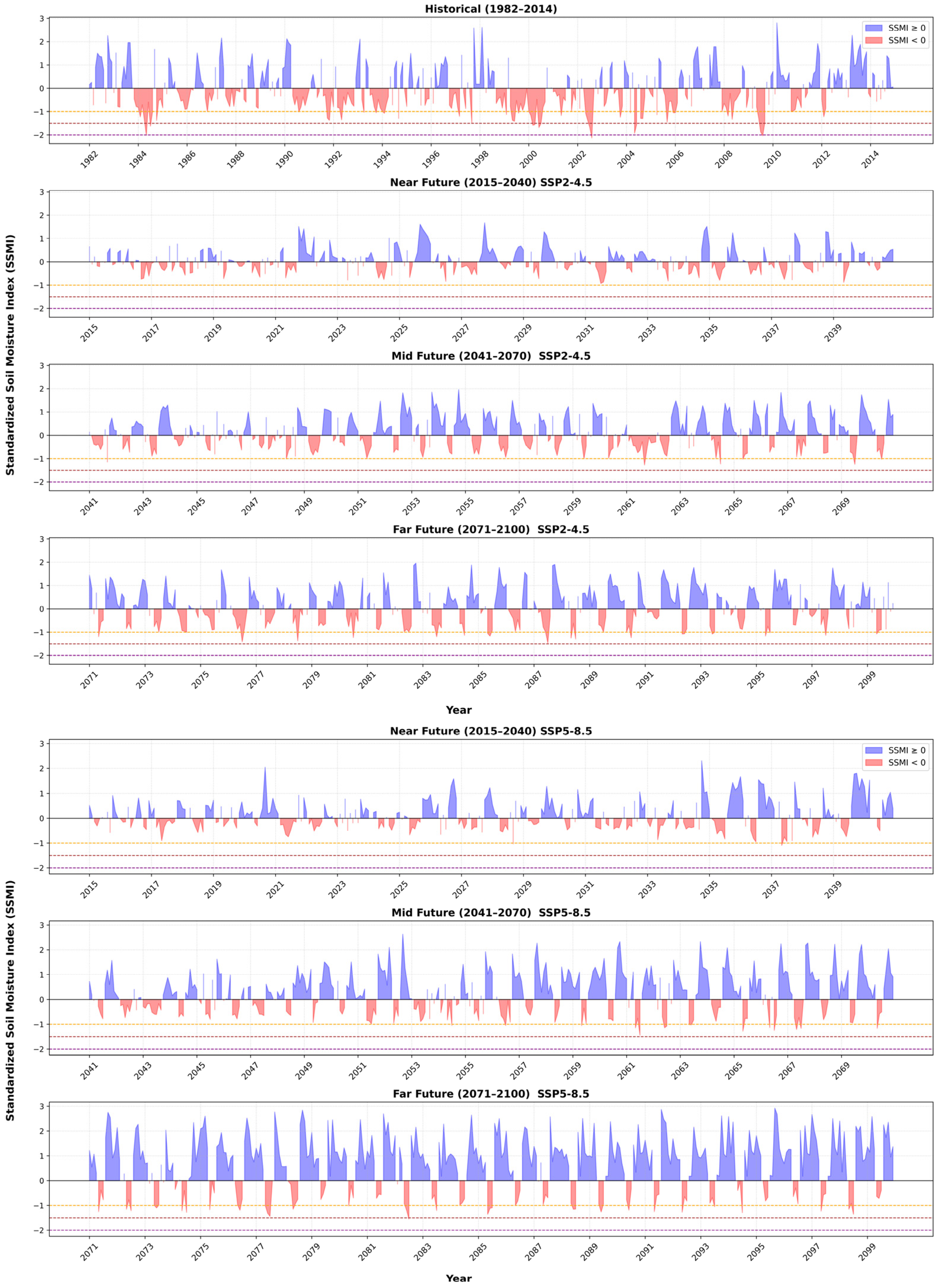 - Xu, F.; Qu, Y.; Bento, V.A.; Song, H.; Qiu, J.; Qi, J.; Wan, L.; Zhang, R.; Miao, L.; Zhang, X.; et al. Understanding climate change impacts on drought in China over the 21st century: A multi-model assessment from CMIP6. NPJ Clim. Atmos. Sci. 2024, 7, 32. [Google Scholar] [CrossRef]