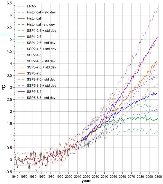 Graphs of changes in annual anomalies of average NSAT of the Brazilian region (10° N–40° S) × (75–25° W) according to ERA5 data (black) for 1940–2023 and according to the results of CMIP6 model experiments for scenarios: Historical (red) for 1940–2014, SSP1-2.6 (green), SSP2-4.5 (blue), SSP3-7.0 (orange), and SSP5-8.5 (purple) for 2015–2099. The boundaries of the variability ranges of 33 CMIP6 models (standard deviation) are represented by dashed lines.