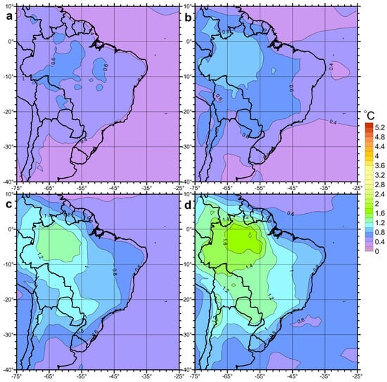 An analysis of long-term changes and seasonal variability in NSAT across South America throughout the twenty-first century, employing an ensemble of 22 models from the CMIP6 project, was conducted in []. The study highlights the dependence of these results on the socio-economic pathway assumed for each country (SSP1-2.6, SSP2-4.5, and SSP5-8.5) []. The analysis identified positive trends in all models, with values ranging from 0.45 ± 0.05 to 2.05 ± 0.31 °C within the historical experiment. However, the most substantial trends were observed for the projected periods, with values ranging from 0.9 ± 0.8 to 2.9 ± 0.6 °C (SSP1-2.6), from 1.4 ± 0.9 to 5.3 ± 0.8 °C (SSP2-4.5), and from 4.8 ± 0.6 to 8.8 ± 0.7 °C (SSP5-8.5). Maximum values were noted in Bolivia, Brazil, Paraguay, and Venezuela, while minimum values were found in Argentina and Uruguay, irrespective of the specific SSP scenario considered.
