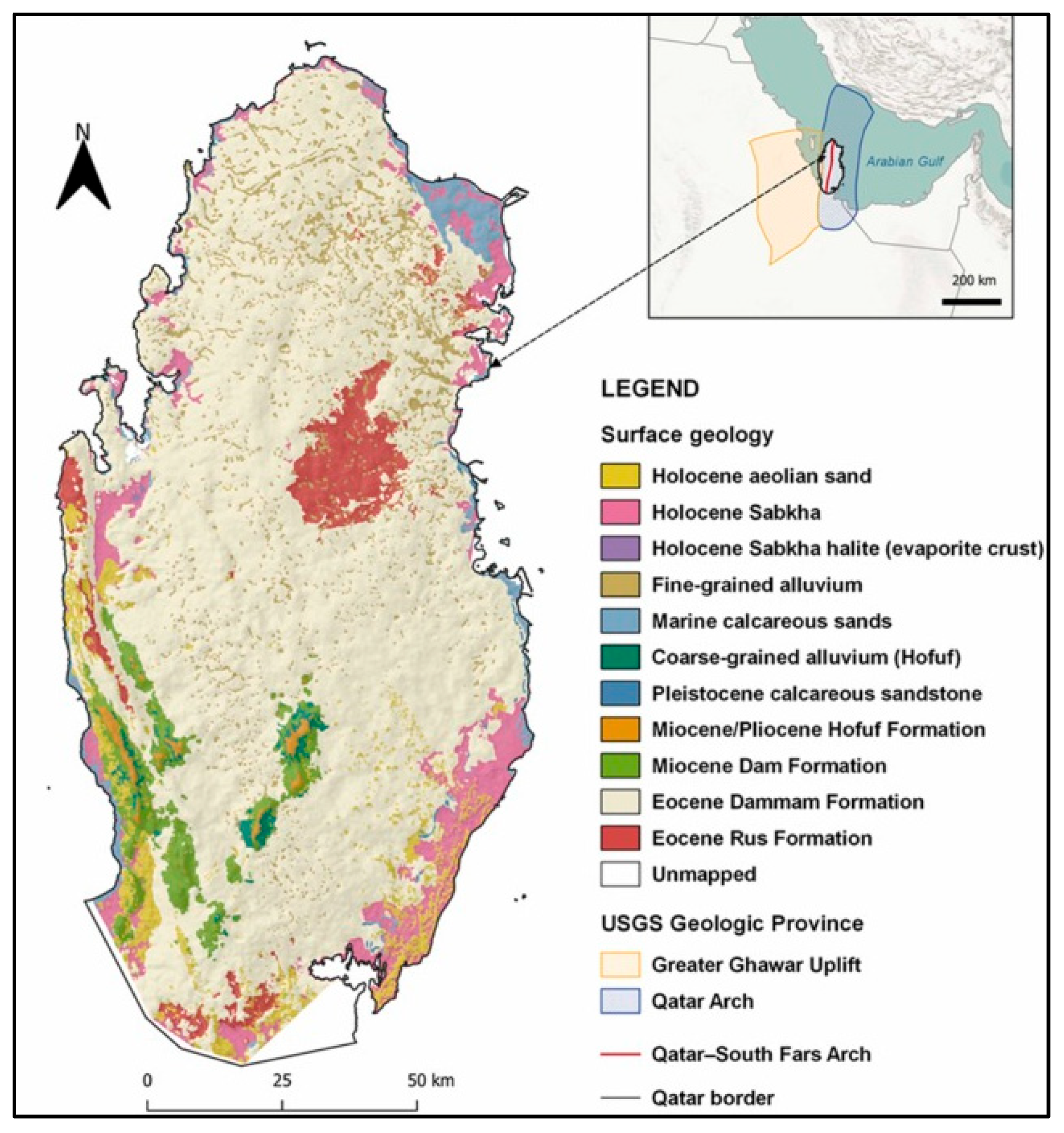 - Al-Hinai, G.A.; Brook, S.S. Geomorphology of Qatar: A Comprehensive Overview. In Remote Sensing of Geomorphology; Springer: Berlin/Heidelberg, Germany, 2017; pp. 53–73. [Google Scholar]