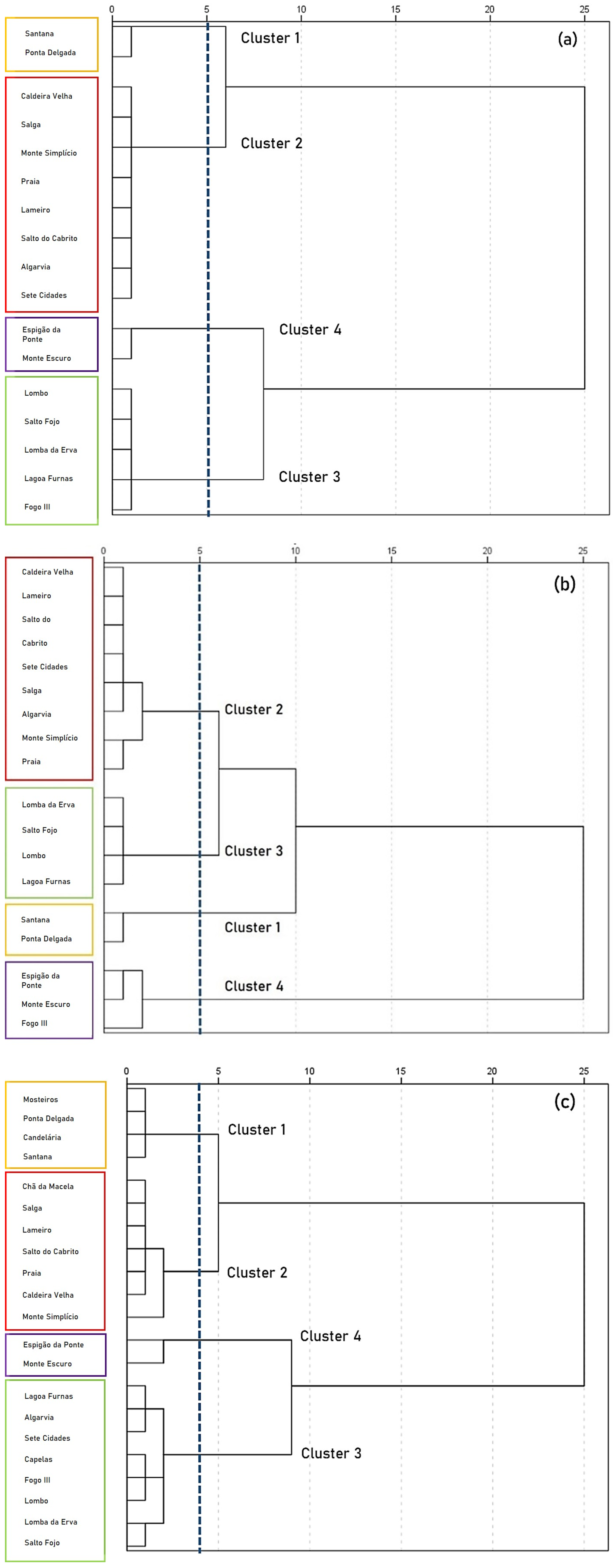 Figure 5a), Cluster 1 comprises the stations of Santana and Ponta Delgada. Cluster 2 includes eight stations: Caldeira Velha, Salga, Monte Simplício, Praia, Lameiro, Salto do Cabrito, Algarvia, and Sete Cidades. Cluster 3 consists of five stations: Lombo, Salto do Fojo, Lomba da Erva, Lagoa das Furnas, and Fogo III. Lastly, Cluster 4 includes the stations of Monte Escuro and Espigão da Ponte.