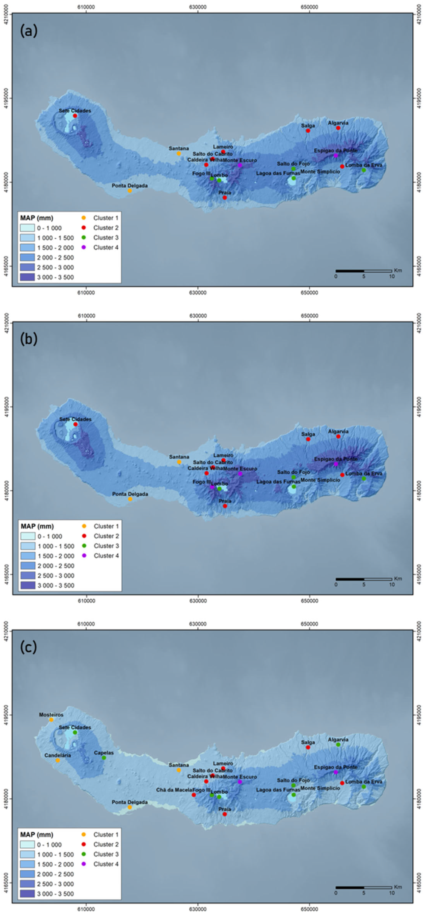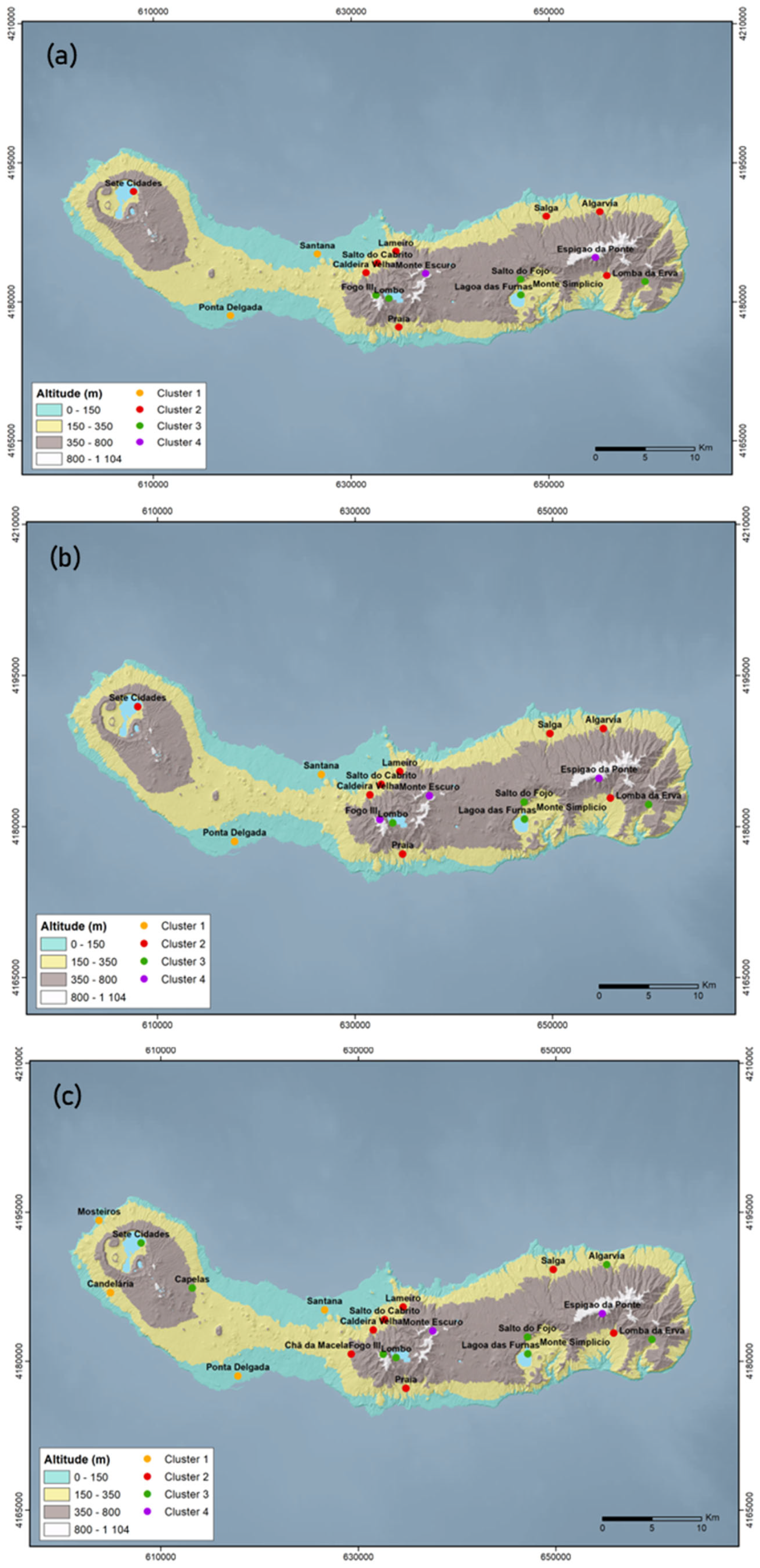 Figure 7c). Rainfall stations belonging to Cluster 2 are located within the intermediate altitude range of 150 to 350 m, whereas rainfall stations in Cluster 3 are generally found at higher altitudes, between 350 and 800 m, except Lagoa das Furnas station. Despite its altitude of 280 m, it consistently remains within Cluster 3, as observed for the full dataset. The analysis of the latest sub-dataset shows that the Sete Cidades and Algarvia stations, located at altitudes of 260 m and 340 m, respectively, are included in Cluster 3 (
