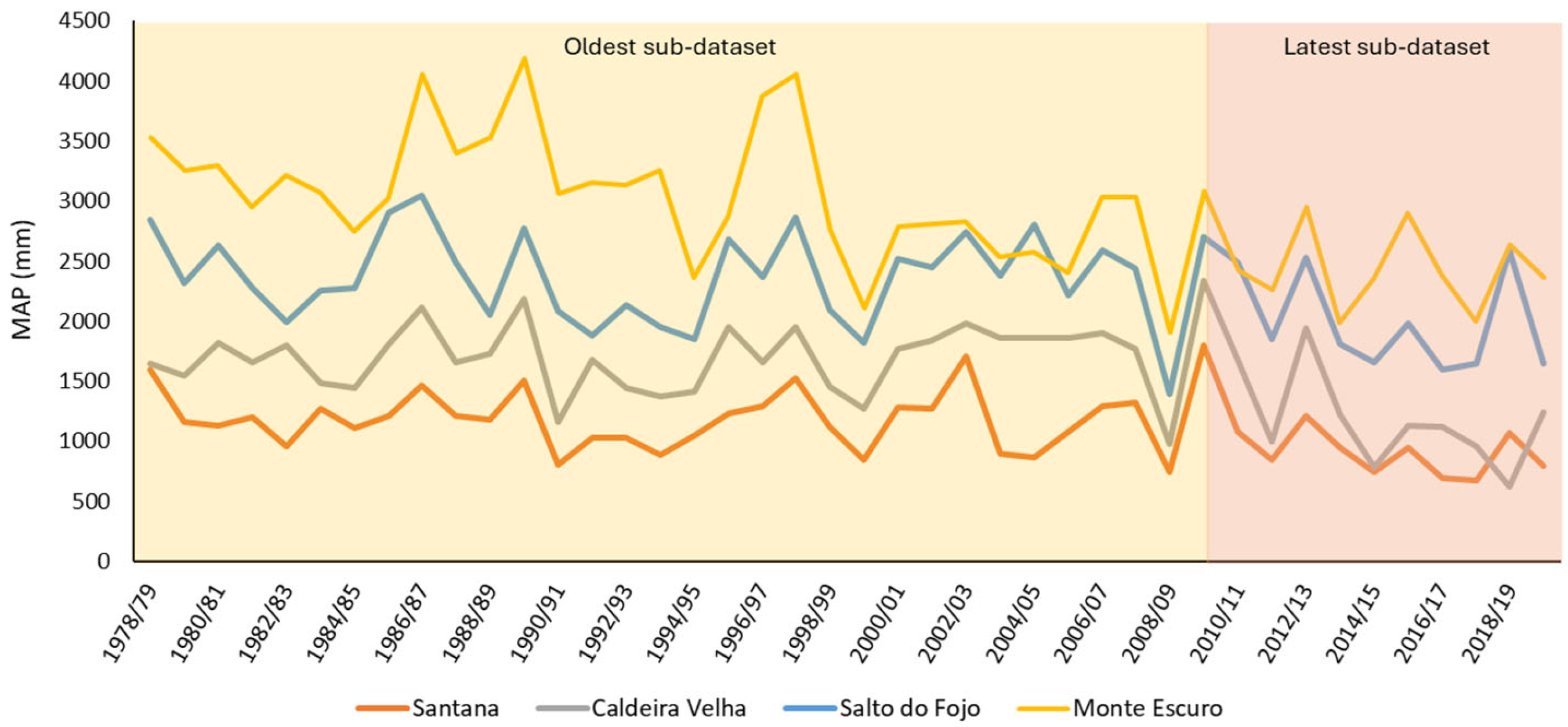 Figure 8 shows the evolution of the Mean Annual Rainfall (MAP) at four representative stations with the most pronounced decreasing rainfall trends—Santana (Cluster 1), Caldeira Velha (Cluster 2), Salto do Fojo (Cluster 3), and Monte Escuro (Cluster 4)—over the climatological years of 1978/79 and 2019/20. During the period corresponding to the oldest sub-dataset (1978/79 to 2009/10), all stations exhibit high interannual variability, reflecting the markedly unstable nature of the regional rainfall regime. However, in the most recent sub-dataset (2010/11 to 2019/20), a general reduction in MAP becomes evident.