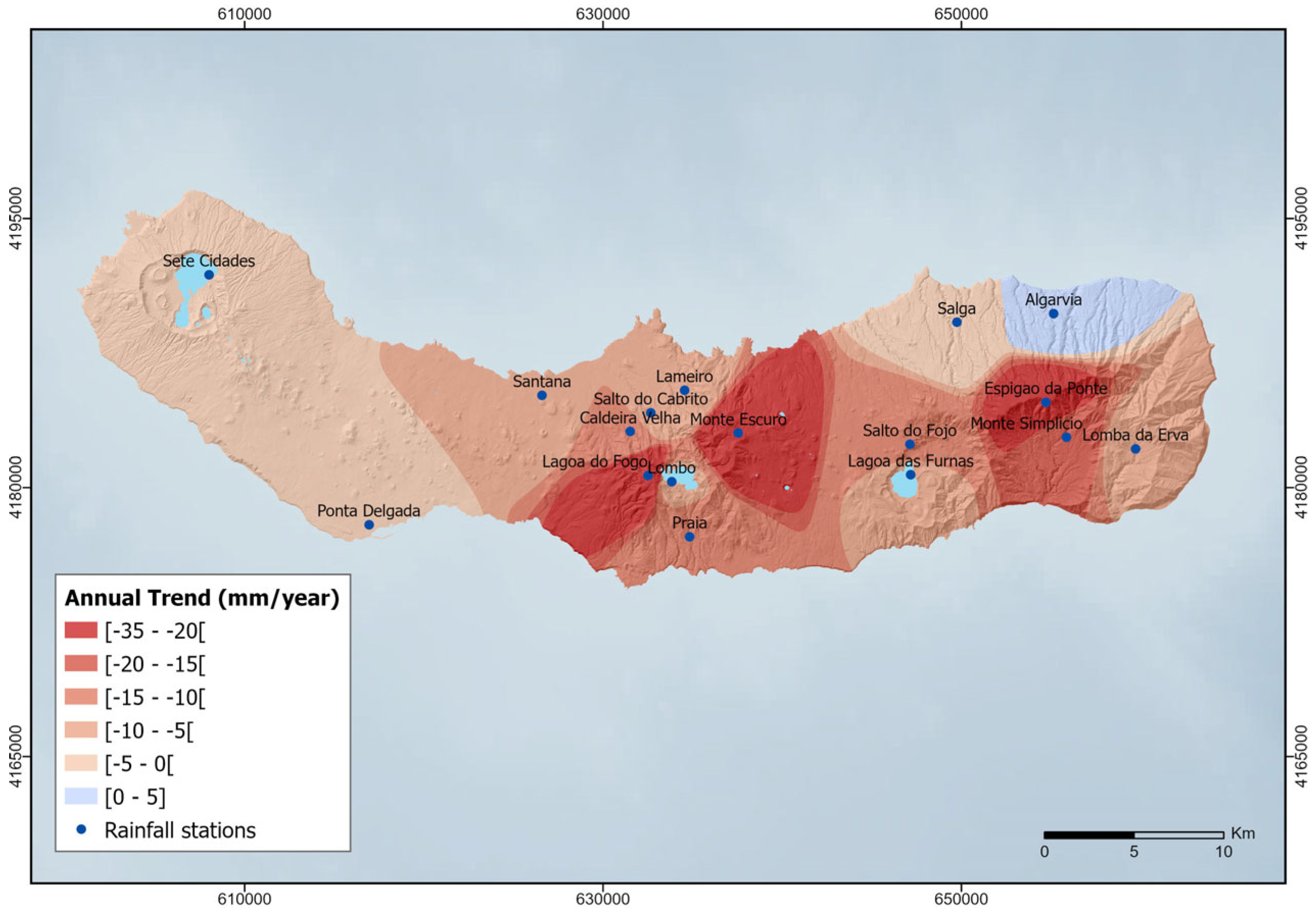At the annual scale, most stations exhibit negative coefficients, several of which are statistically significant at the 95% confidence level, notably at Salto do Cabrito (ρ = −0.46, p < 0.01), Ponta Delgada (ρ = −0.38, p = 0.01), Sete Cidades (ρ = −0.33, p = 0.03), Monte Simplício (ρ = −0.33, p = 0.04), Lagoa das Furnas (ρ = −0.35, p = 0.02), and Lomba da Erva (ρ = −0.33, p = 0.04).