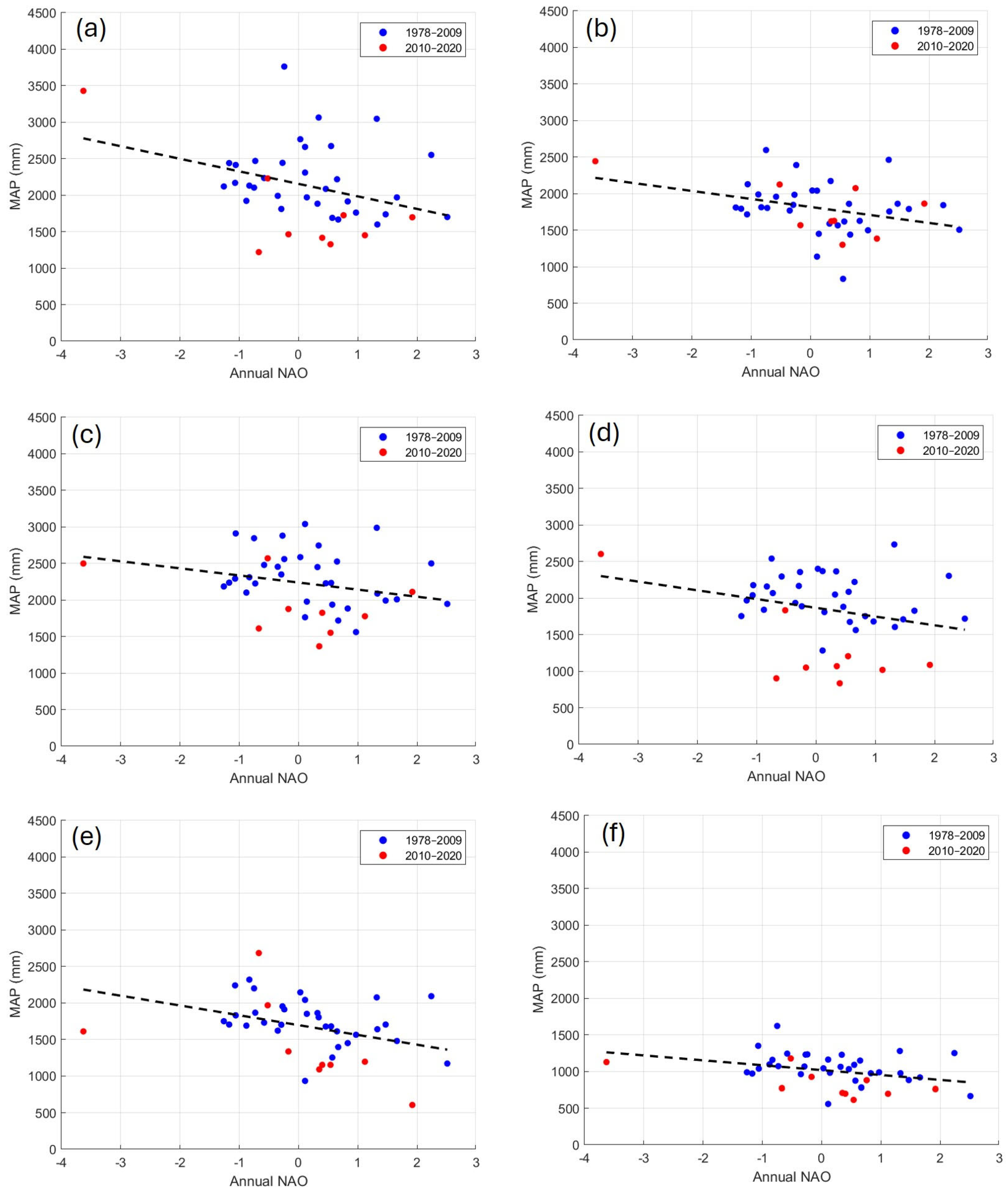 Figure 10, which presents scatter plots of annual rainfall versus the NAO index, with data points from the latest sub-dataset (2010–2020) highlighted in red. In general, years with higher NAO values correspond to lower annual rainfall totals. The MAP values in the latest sub-dataset are consistently lower than would be expected.