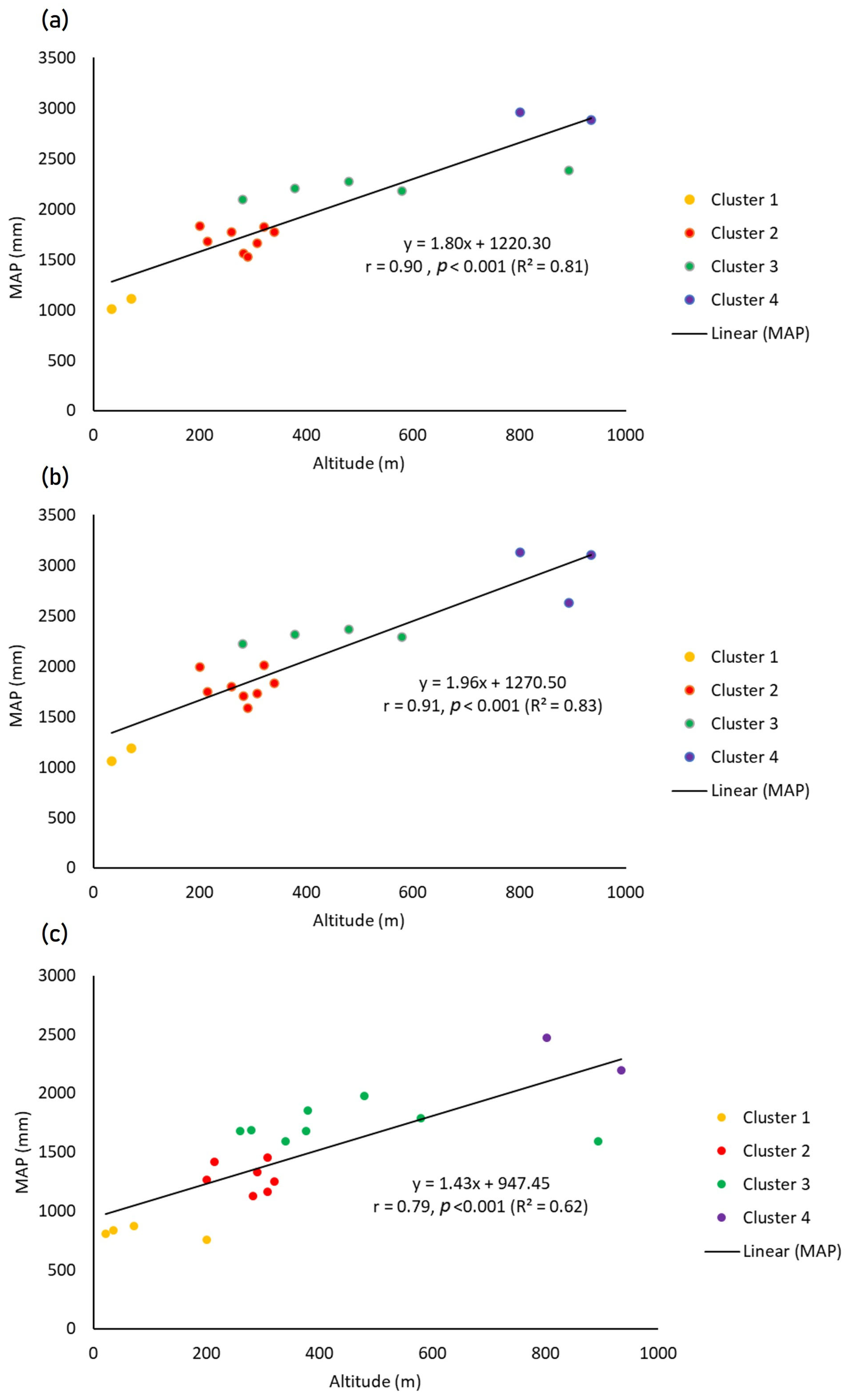 For the full dataset, the correlation coefficient between MAP and altitude is 0.81, indicating a strong positive relationship. The linear regression model suggests that MAP increases by approximately 180 mm for every 100 m of elevation gain (