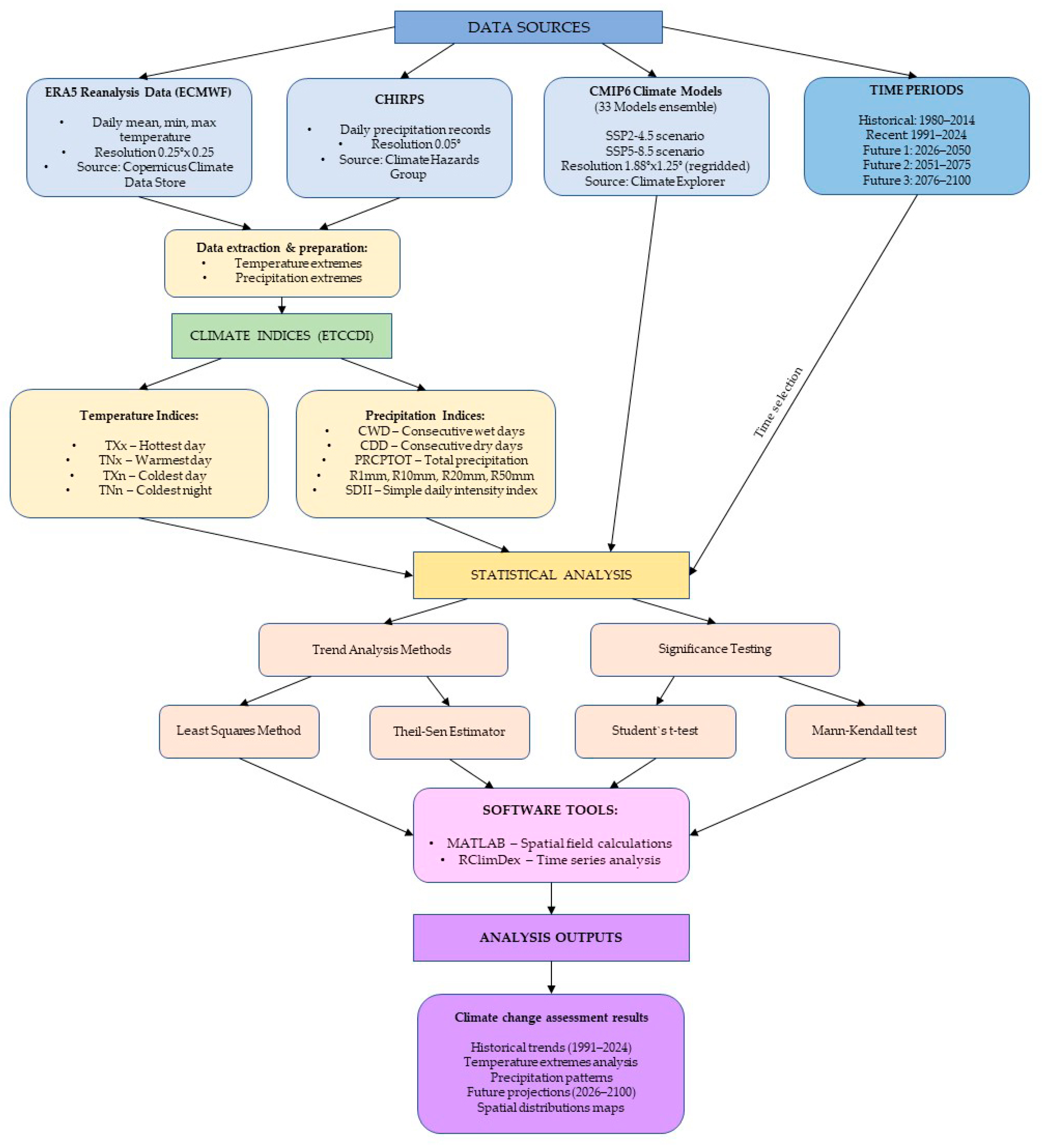 The calculation of spatial fields for key meteorological parameters and their extremes was performed in Matlab R2024a. Time series analysis was conducted using the RClimDex 2.0 software [88] (Figure 2).