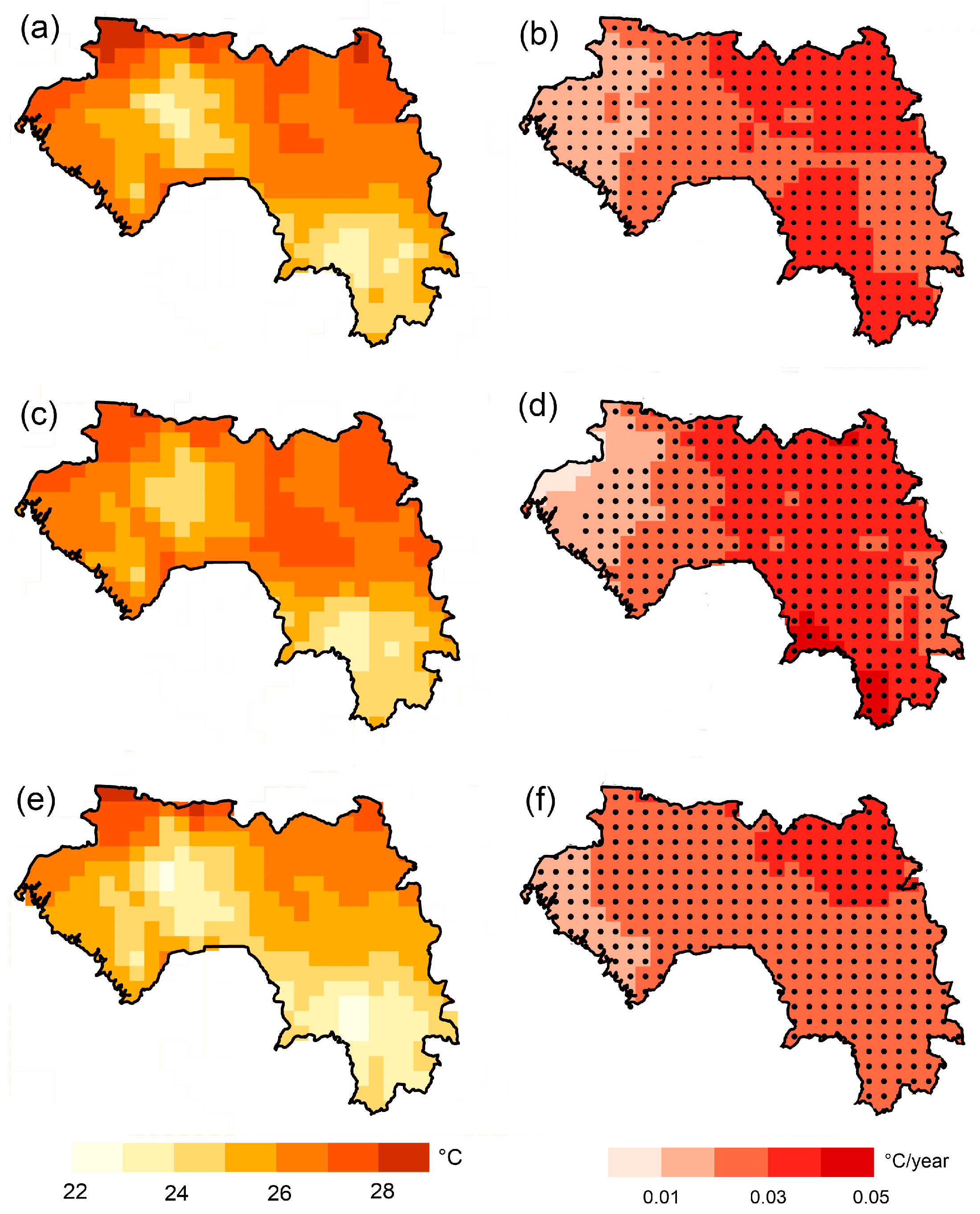 Spatially heterogeneous trends were identified across Guinea. An increase in precipitation was observed on the coast (up to +200 mm/decade), while a decrease was detected in the mountainous areas (up to –250 mm/decade). The most significant warming was found in the southern and eastern regions (up to +0.9 °C/decade for TXx), whereas the coastal zone exhibited a slower rate of temperature increase. The analysis showed that maximum daily temperatures (TXx) are rising faster than minimum temperatures (TNn), which increases the risks of heatwaves, particularly in arid regions (Upper Guinea).