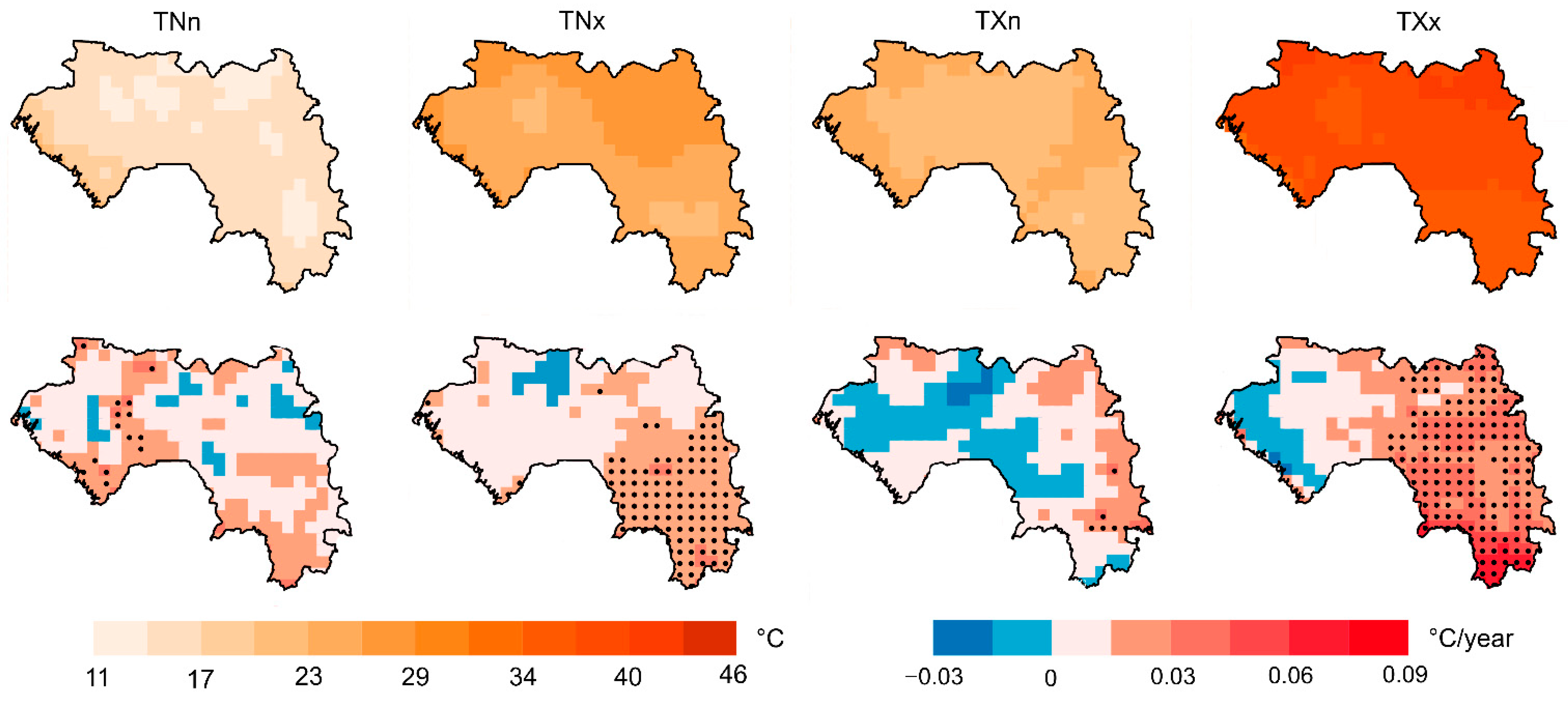 The analysis of extreme daytime temperatures was conducted using the TXx and TXn indices, representing annual absolute extremes of daily maximum temperatures. Mean values of maximum temperature minima (TXn) across Guinea ranged from 20 °C to 26 °C (Figure 4). The absolute maximum temperatures (TXx) during 1991–2024 reached 46 °C in the northeastern part of the country. Positive and statistically significant warming trends in TXx were observed across nearly all of Guinea, except for the coastal zone. The most rapid warming occurred in southern regions (+0.9 °C per decade). In contrast, trends in maximum temperature minima (TXn) showed spatially heterogeneous changes that were statistically insignificant throughout Guinea.
