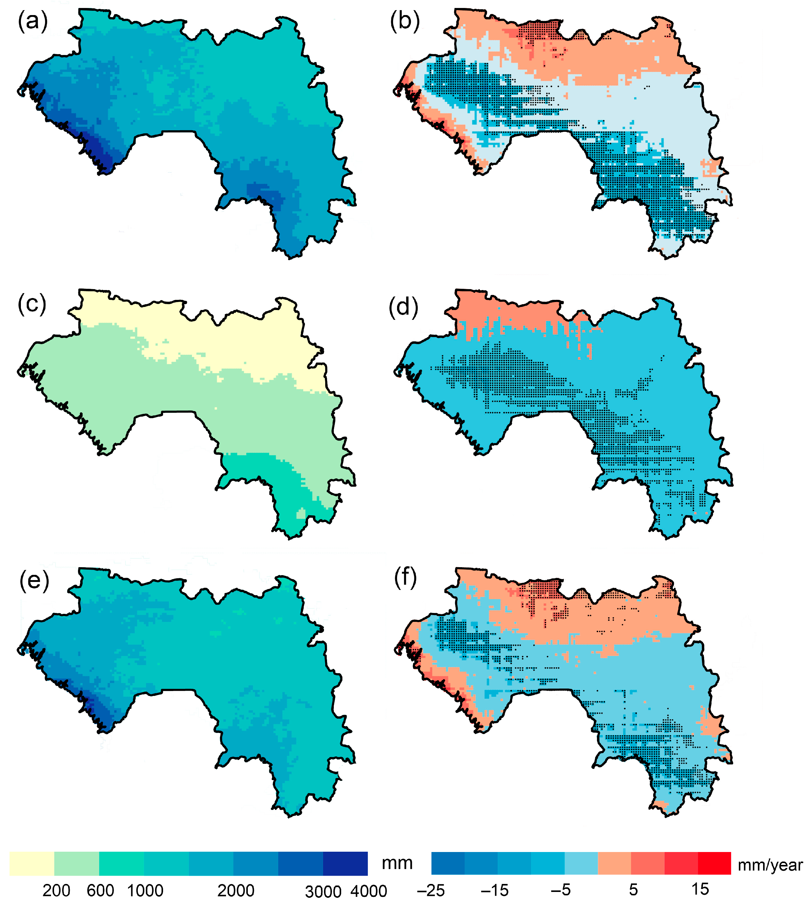 The analysis of precipitation patterns in Guinea during 1991–2024 revealed significant spatial and temporal variations. Annual precipitation totals ranged from 1000 mm in the northern regions to 3800 mm along the coast, with the coastal zone receiving the highest amounts while the northeastern areas remained relatively drier (Figure 5). The study identified contrasting precipitation trends across different regions of the country. Positive trends were observed along the coast, where precipitation increased by up to 200 mm per decade, and in northern areas, where the increase was statistically significant. In contrast, most other regions showed declining precipitation, with particularly notable and statistically significant reductions in highland areas, where annual precipitation decreased at a rate of 250 mm per decade. Seasonal analysis demonstrated distinct patterns in precipitation distribution. During the dry season, precipitation did not exceed 1000 mm nationwide, with maximum amounts occurring along the coast and in the southeastern regions. A countrywide reduction in dry season precipitation was observed, reaching statistically significant levels in the southeast (up to 100 mm per decade decrease). The rainy season brought substantially higher precipitation, with coastal areas receiving up to 3200 mm. While most of Guinea experienced decreasing trends in rainy season precipitation, the coastal zone showed a statistically significant increase of up to 200 mm per decade.