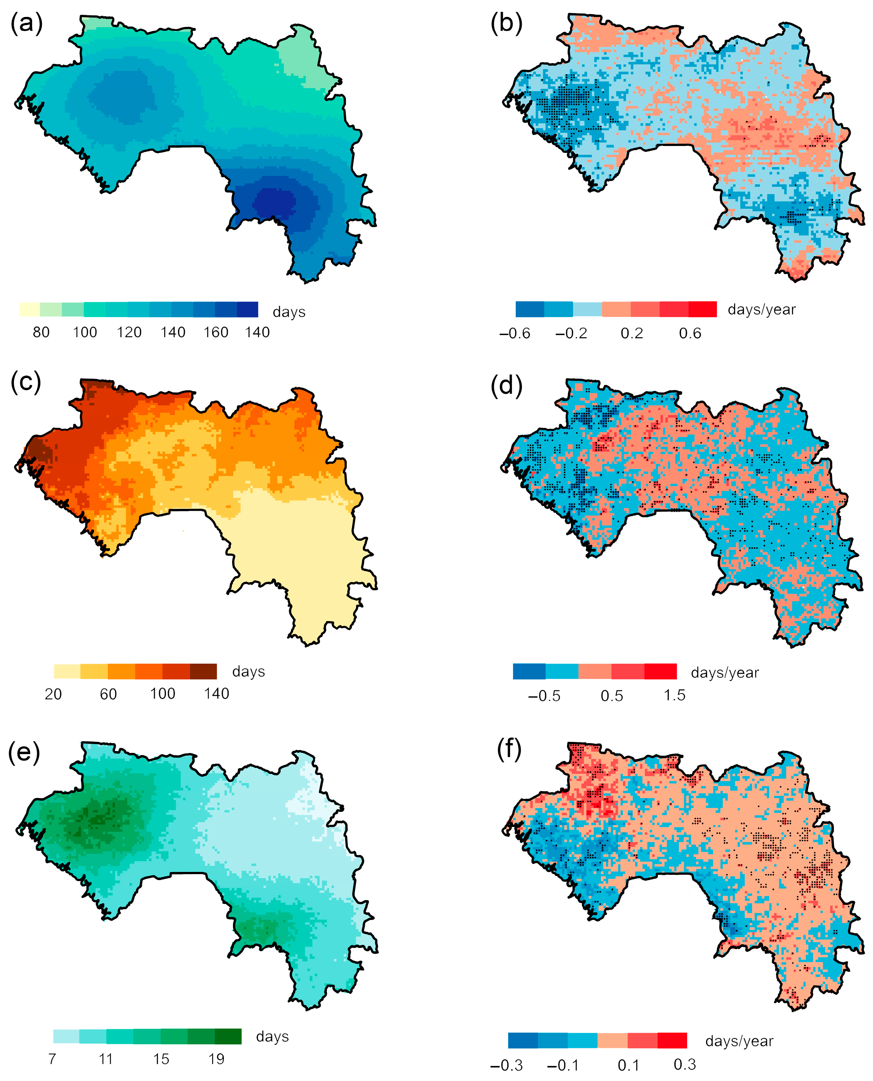 Guinea’s monsoon climate creates a stark contrast between summer precipitation dominance and near-complete winter dryness. The analysis reveals several key spatial and temporal patterns in precipitation characteristics. Areas with maximum rainy days (precipitation > 1 mm) are concentrated in mountainous regions, showing 150–180 wet days annually (Figure 6). Most regions exhibit declining trends in rainy days, with statistically significant reductions in the northwest (up to –6 days/decade) and southeast. The duration of wet/dry spells was analyzed using CWD (consecutive wet days) and CDD (consecutive dry days) indices. During 1991–2024, maximum mean CWD values occurred in the northwest and coastal areas (up to 21 days), while the northeast showed minimal values (7–9 days). Extreme CWD values reached 65 days in some years. Notable trends include decreasing CWD along the coast and western regions (up to –3 days/decade), significant reduction in coastal wet spells and pronounced increase in eastern wet periods (+3 days/decade). Dry spell duration varied widely across Guinea: 20 days in southeast and 120–140 days in northwest.