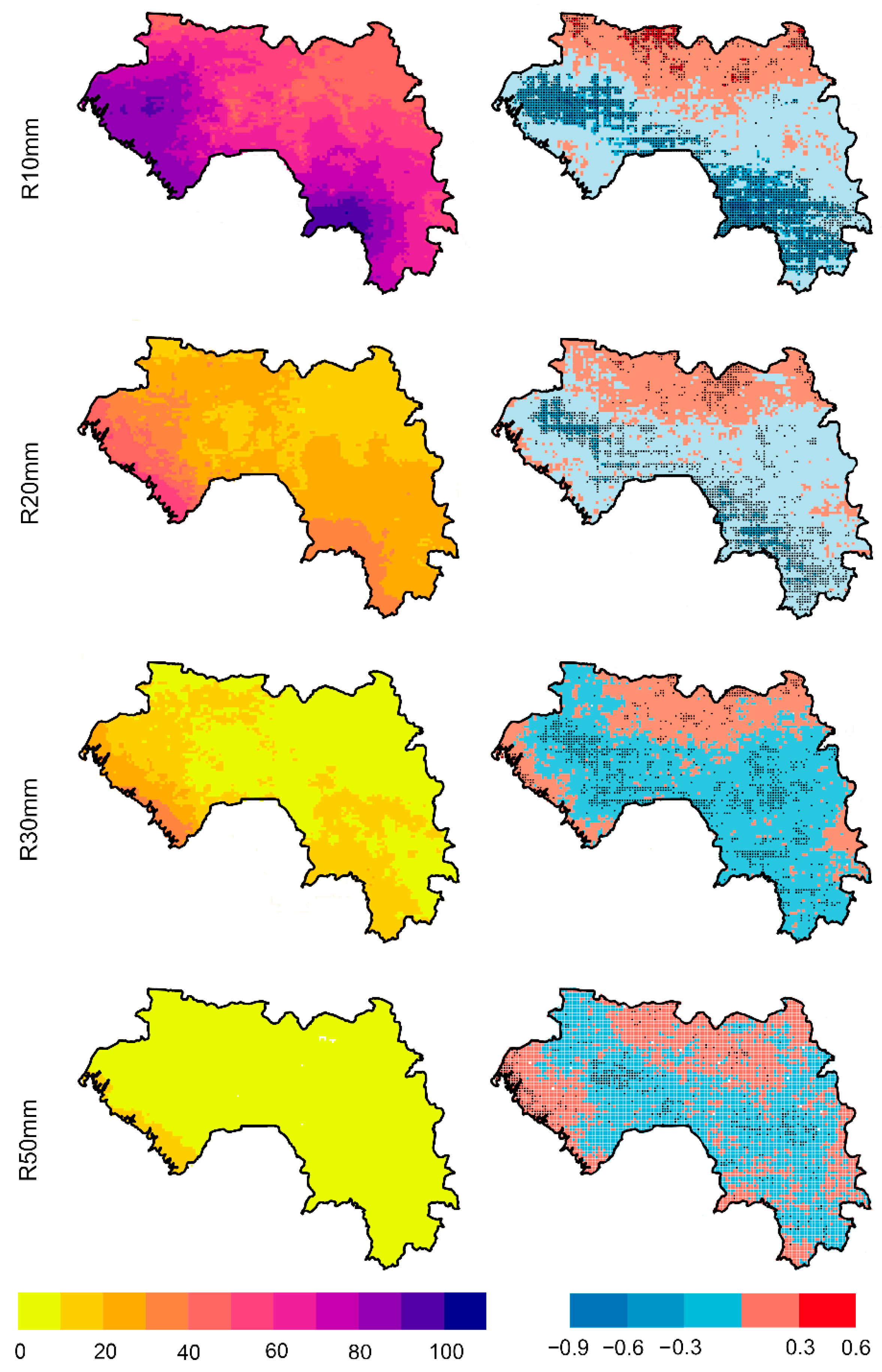 The R10mm index reaches up to 140 days per year, R20mm—50 days, and R30mm—40 days. Values of the R50mm index do not exceed 10 days per year across most of the country, with increased values (up to 20 days per year) observed in coastal areas. All indices show decreasing trends in the number of extreme precipitation days in northwestern and southeastern Guinea (Figure 8). The most pronounced reductions are observed for the more extreme thresholds (R30mm and R50mm), indicating a transformation of heavy precipitation patterns that may significantly impact water resources and agricultural systems in these regions. In contrast, the relative stability of these indices in coastal areas highlights the spatial heterogeneity of changing precipitation extremes across the country.