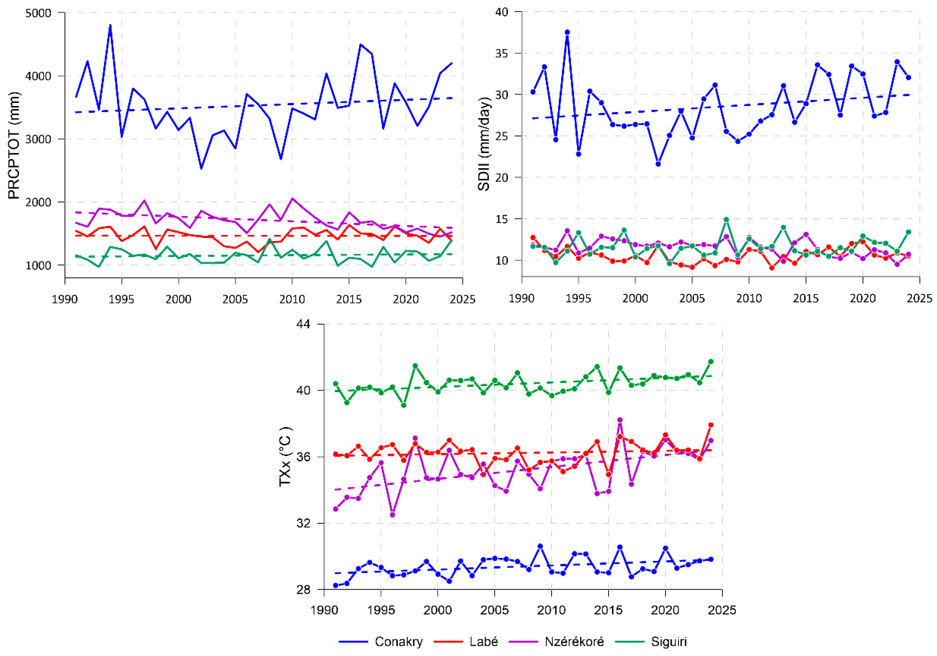 All physical-geographical regions of Guinea exhibit a consistent increase in maximum air temperatures (TXx), with Forest Guinea showing the most dramatic warming trend at 0.7 °C per decade (Figure 9, Table 4). This southeastern region simultaneously experiences concerning climatic changes: decreasing annual precipitation, reduced precipitation intensity, and fewer days with extreme precipitation (R20mm index), creating compounding stresses on its tropical forest ecosystems. Upper Guinea, represented by Siguiri, demonstrates similar temperature increases alongside modest precipitation gains, presenting particular challenges for this Sahel-adjacent region where rising heat threatens traditional pastoral livelihoods. Middle Guinea’s declining precipitation patterns endanger water security as reduced precipitation in the Fouta Djallon highlands diminishes critical river flows. Contrasting these trends, Lower Guinea faces a dual intensification—both rising temperatures and increasing precipitation intensity—which elevates flood risks in coastal areas while exacerbating urban heat island effects in cities like Conakry.