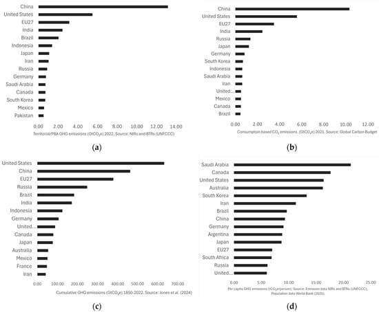 Graphical comparison of the net GHG emissions (CH4, N2O and CO2 fossil and LULUCF emissions) of the 15 biggest emitters under each accounting framework. (a) PBA emissions were obtained from official UNFCCC documents *, namely NIRs, BURs and BTRs (see Supplementary Materials Table S2), and are expressed in GtCO2e. (b) CBA emissions were obtained from the updated work of []. CBA emissions were calculated by subtracting trade flows of carbon emissions from the baseline of territorial emissions, and are expressed in GtCO2. (c) HBA emissions were obtained from the dataset [] and express the cumulative total from 1850 to 2022 in GtCO2e. (d) PCBA emissions were obtained by dividing national PBA emissions * by the total population estimates of each country from the World Bank. They are expressed in tons per capita (tCO2e/p). * Iran, Vietnam, and India have not submitted the mandatory BTR, with their latest NC or BUR being from 2010, 2016, and 2020, respectively. China, Pakistan, and Saudi Arabia have all submitted BTRs, with the coverage year being 2021. For all the aforementioned, their data is an estimation from [] for the year 2022.