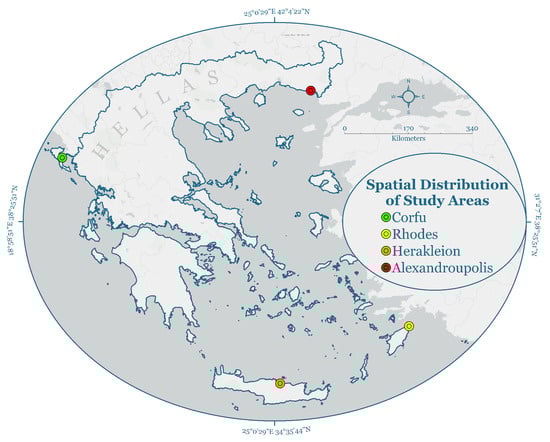 Location of the four study areas in Greece: Corfu, Rhodes, Alexandroupolis, and Herakleion.