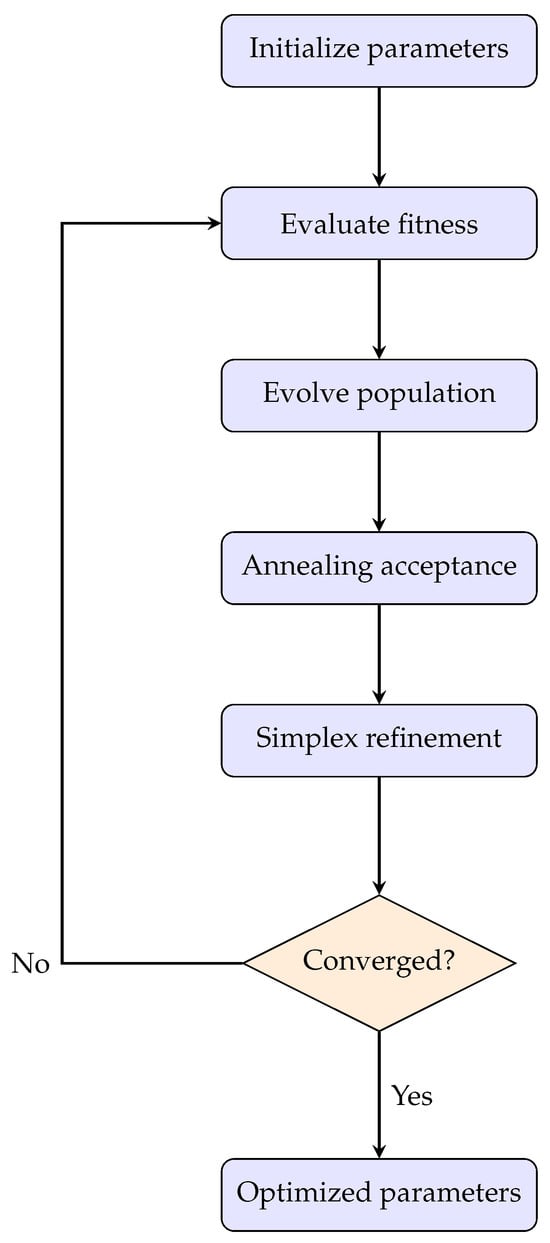 Evolutionary algorithm techniques enable global exploration, developing fresh solutions through mutation and crossover, which provides diversity and allows the algorithm to escape local minima. It is augmented by simulated annealing, which includes a “temperature” parameter in determining whether to accept new solutions. Higher temperatures accept worse answers, which permits exploration, while lower temperatures focus on refining attractive areas of the search space []. This dynamic cooling schedule offers a balance between exploration and exploitation. Once promising solutions have been found, these are refined using the simplex method.