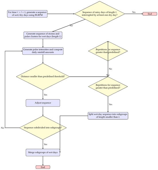 As shown in Figure 4, the first step is to break down the daily rainfall time series into sequences of consecutive days with non-zero rain. Then, for each sequence detected, BLRPM produces synthetic rainfall pulses and subsequently sums up these pulses to calculate the associated daily rainfall. A deviation check is performed to ensure that the synthetic data generated does not significantly deviate from the observed data. This check is made by using a previously defined threshold, , and this process is carried out until the deviation is less than the threshold or the maximum number of iterations is reached. The deviation is calculated according to Equation (5):